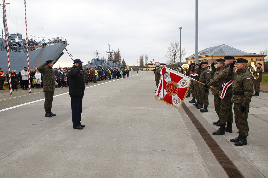 Uroczystość przekazania obowiązków rozpoczęła się od parady burtowej. Oficerowie zdający i obejmujący obowiązki, w towarzystwie zaproszonych gości, przyjęli z pokładu motorówki hydrograficznej MH-1 paradę burtową okrętów stacjonujących w Porcie Wojennym Świnoujście. Złożono również wiązankę kwiatów pod pomnikiem „Tym, którzy przywrócili Pomorze macierzy”. Na uroczystej zbiórce pododdziałów flotylli, meldunek o zdaniu i przyjęciu obowiązków przyjął Inspektor Marynarki Wojennej wiceadmirał Jarosław Ziemiański.