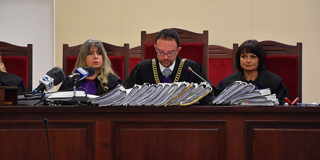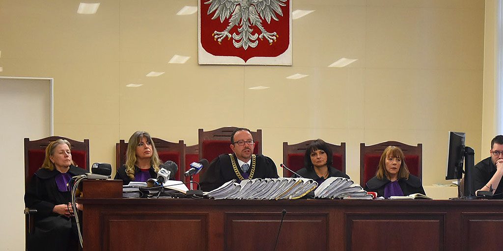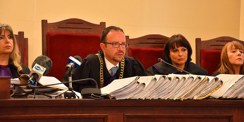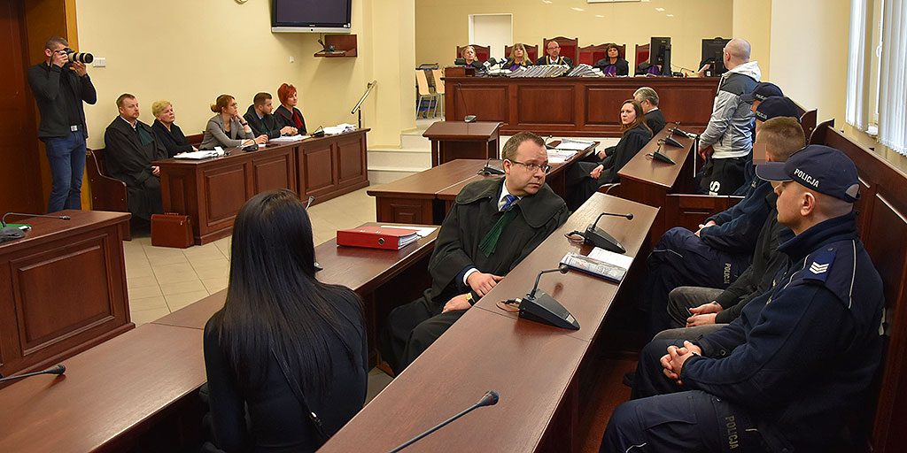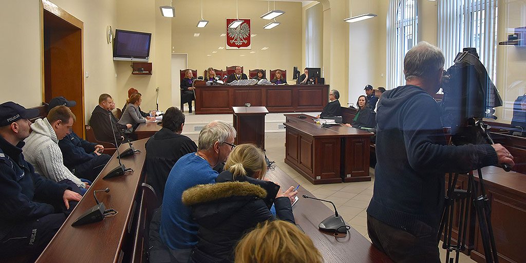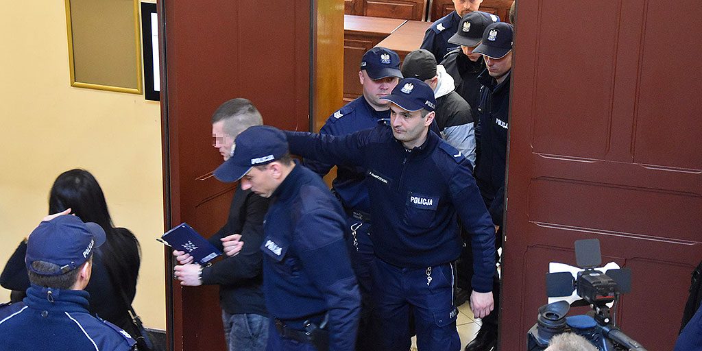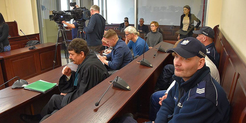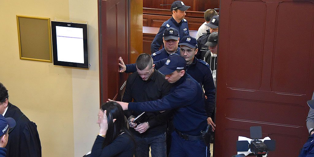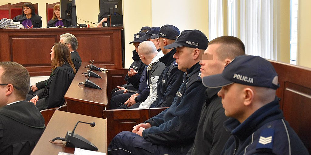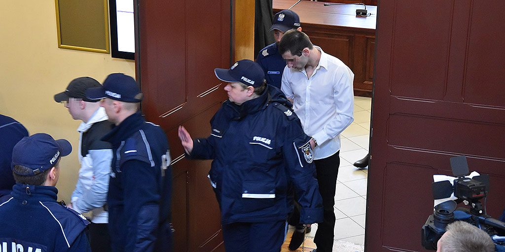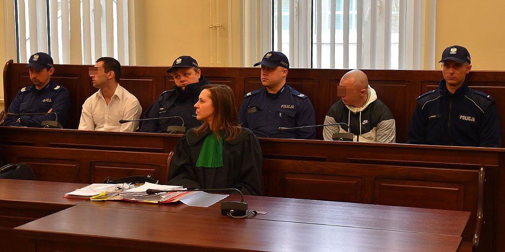 Paweł W., Grzegorz N., Artur P., Grzegorz P. oraz Małgorzata N. – wszyscy stawili się w piątek przed Sądem Okręgowym w Szczecinie. Czterech z nich jest tymczasowo aresztowanych i musieli zostać przekonwojowani z zakładów karnych. Na salę sadową, w asyście policjantów wchodzi pojedynczo, zakuci w kajdany na rękach i nogach. Małgorzata N. to siostra Grzegorza N. jest oskarżona o zacieranie śladów i mataczenie w śledztwie, odpowiada z wolnej stopy. Na sali sądowej była obecna matka zamordowanego Piotra Wawrzynowicza – Małgorzata. Procesowi przewodniczy sędzia Paweł Balcerowicz.
