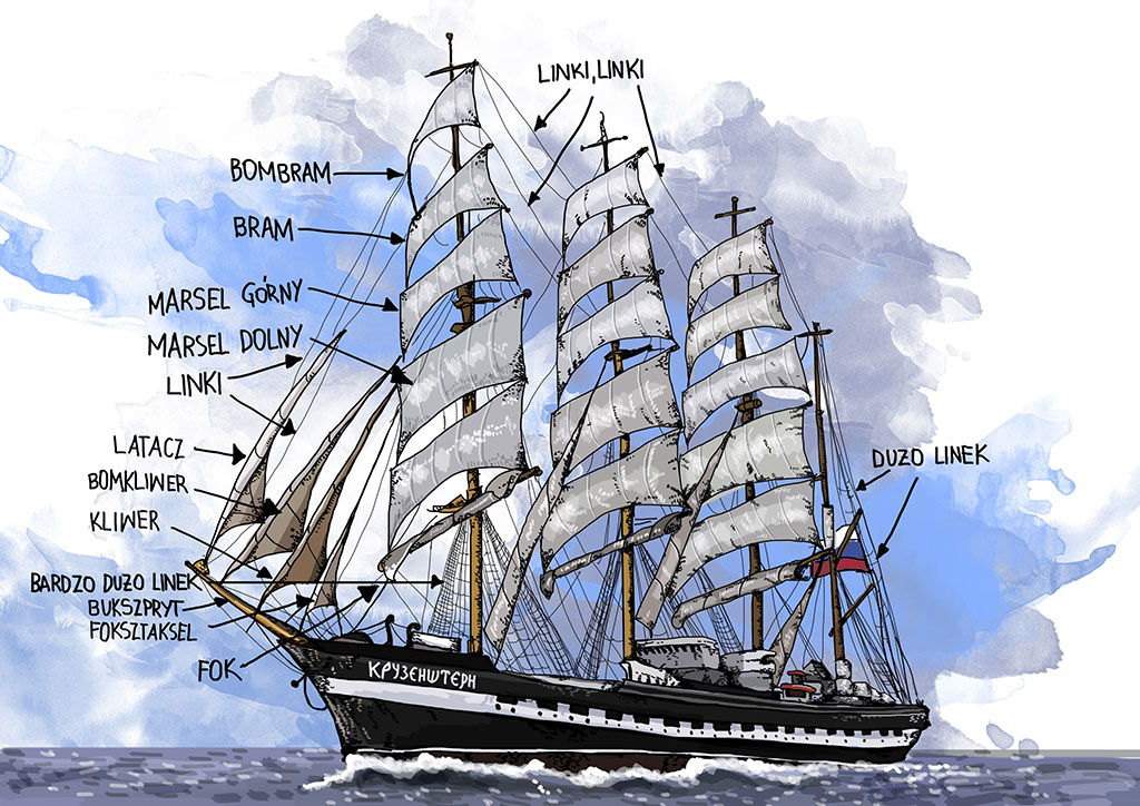 „Kruzensztern” ma 3.630 metrów kwadratowych żagli. Rys. Izabela Kołtan