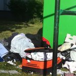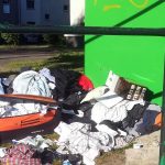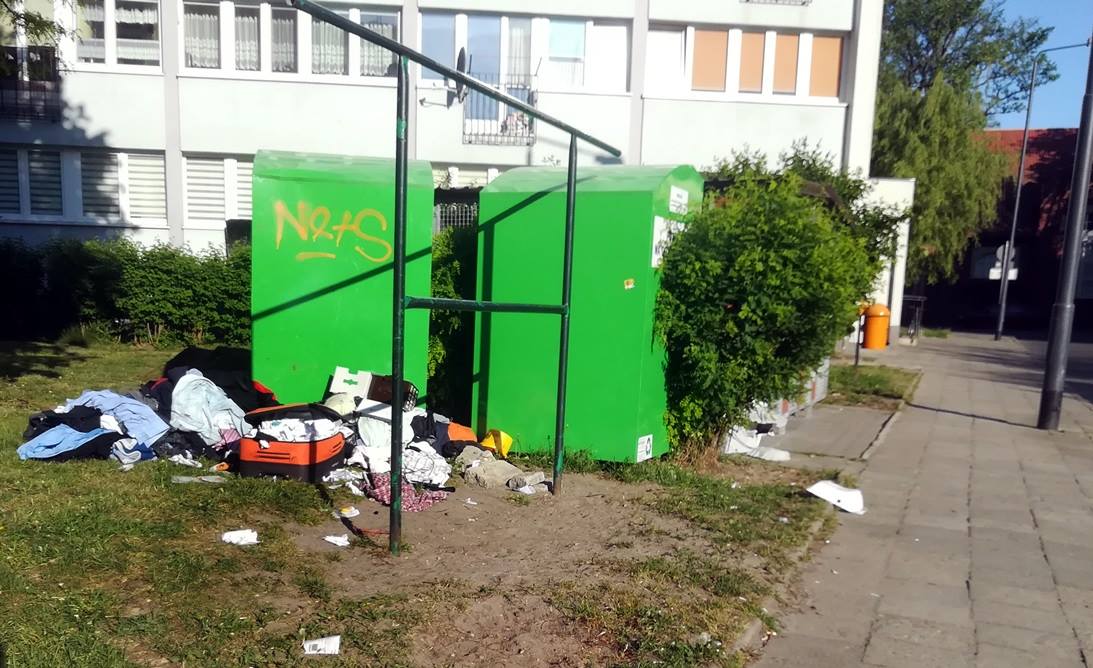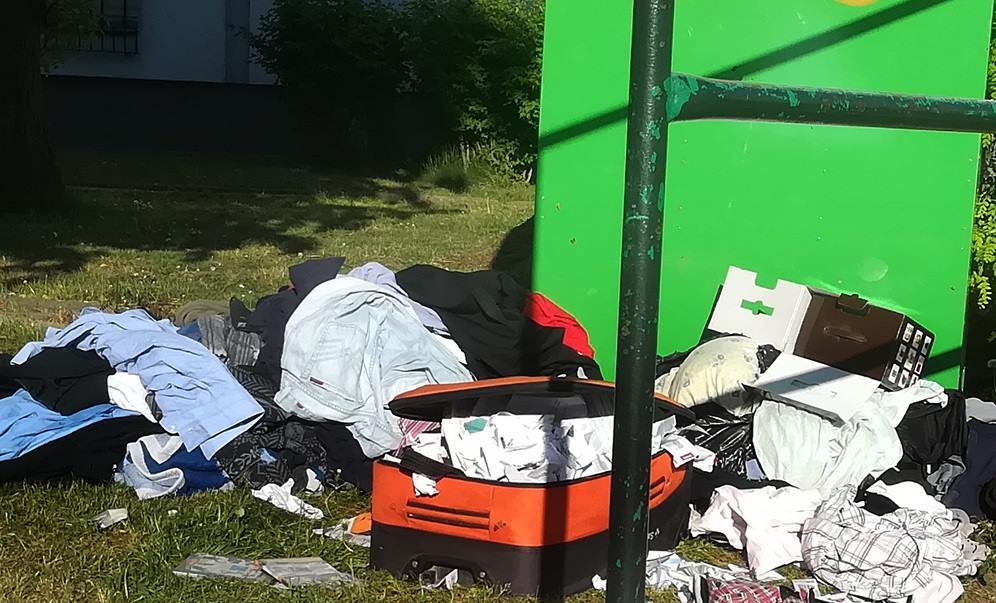 Pomiędzy blokami przy ulicy Konstytucji 3 Maja i Matejki są porozrzucane są ubrania. Wszystkiemu winni są bezdomni, którzy plądrują metalowe pojemniki na używaną odzież.
