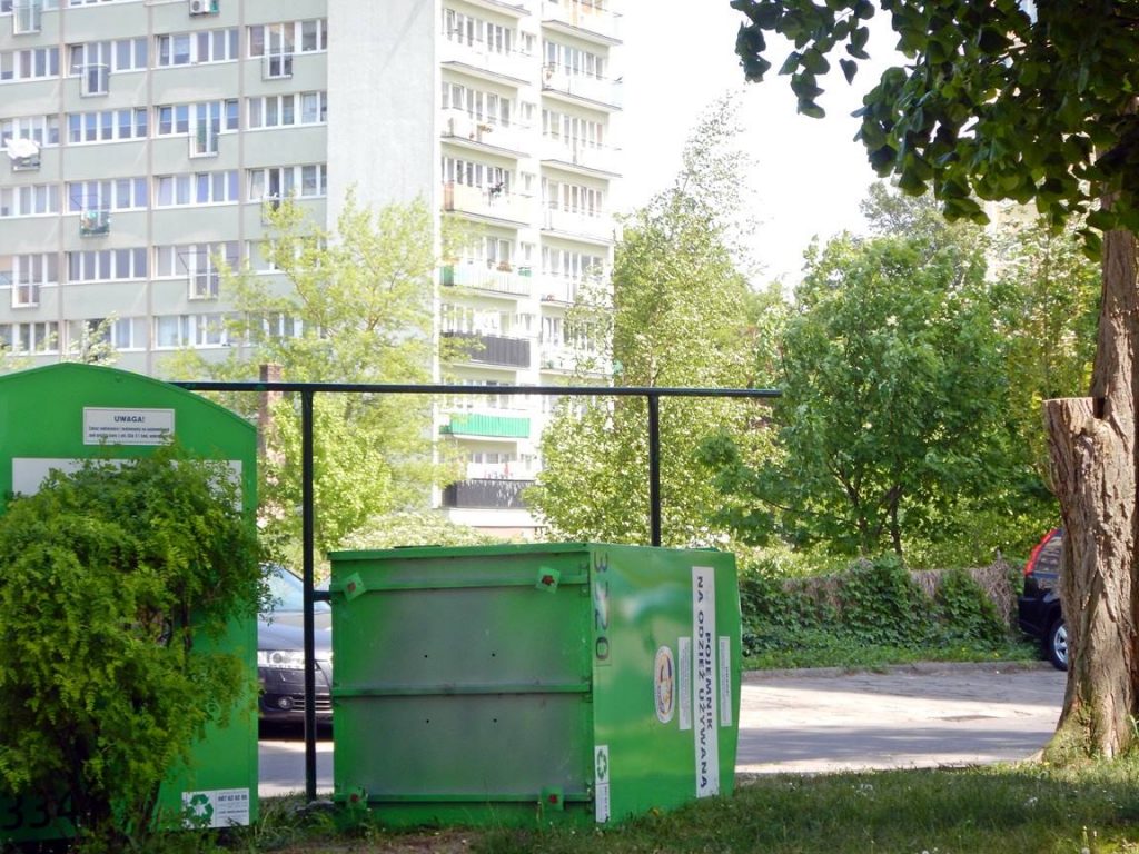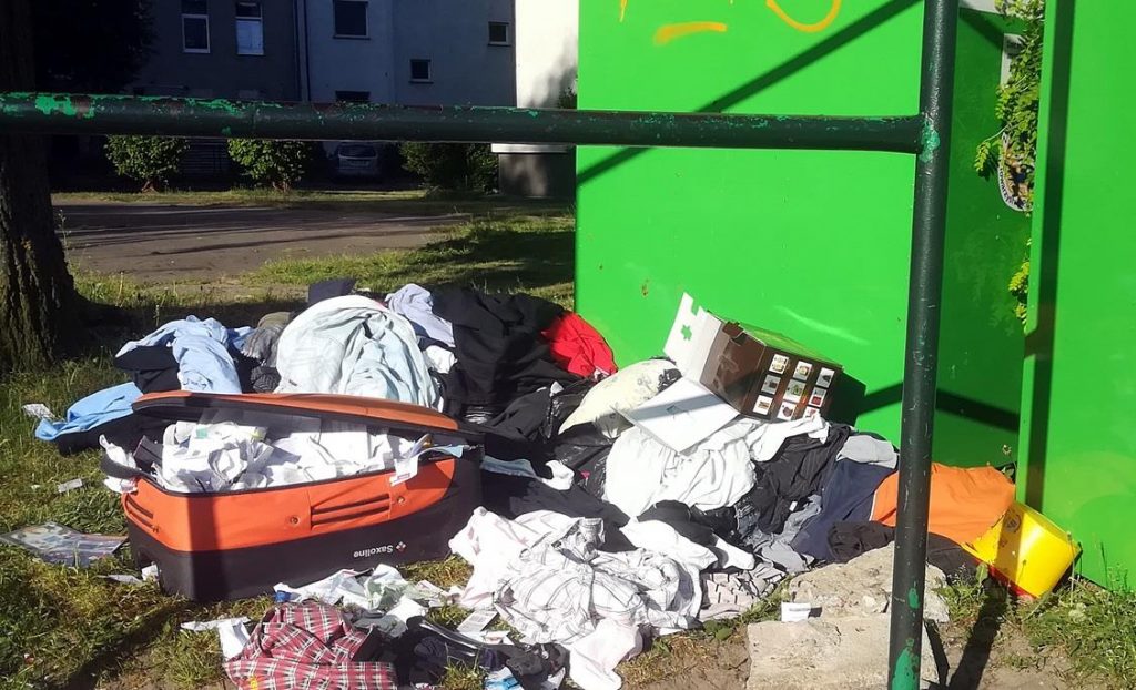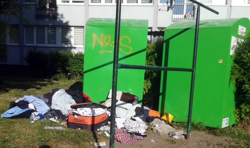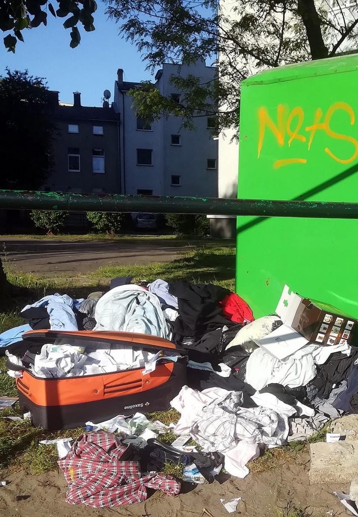 Pomiędzy blokami przy ulicy Konstytucji 3 Maja i Matejki są porozrzucane są ubrania. Wszystkiemu winni są bezdomni, którzy plądrują metalowe pojemniki na używaną odzież.