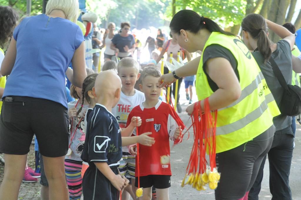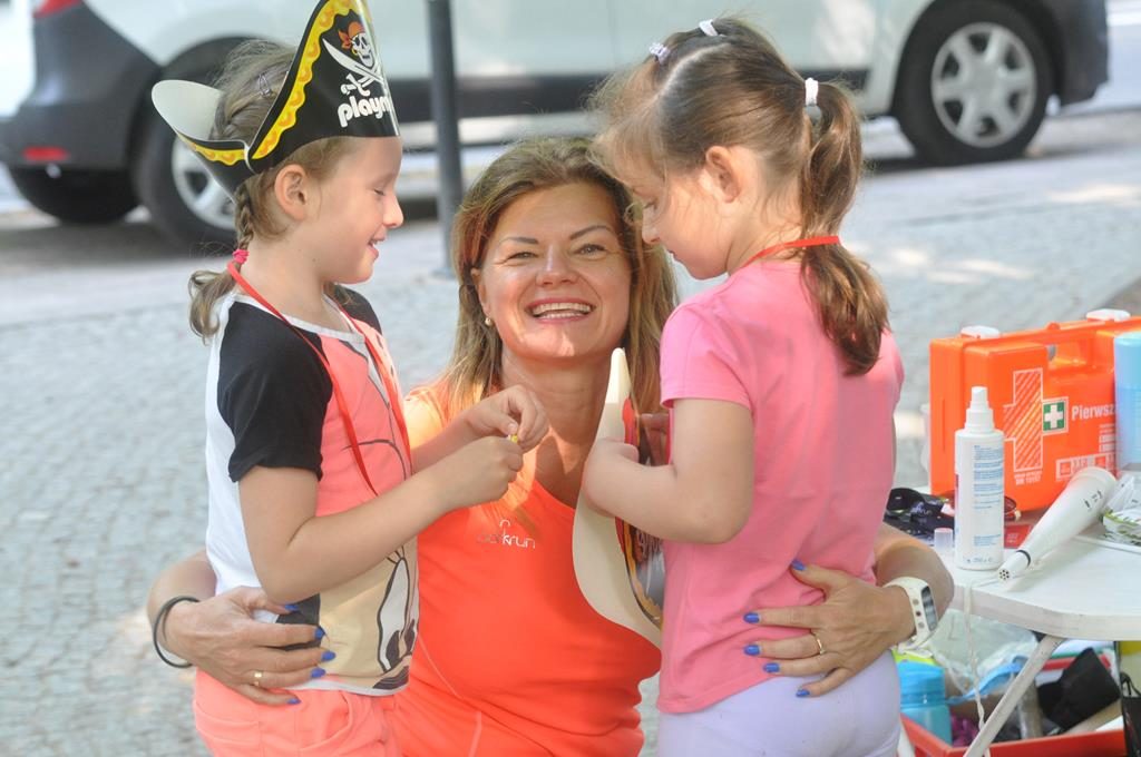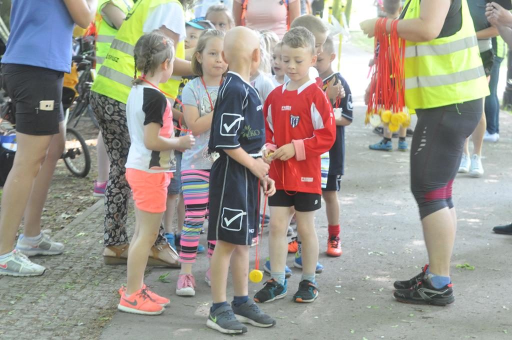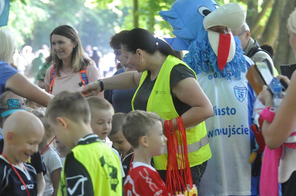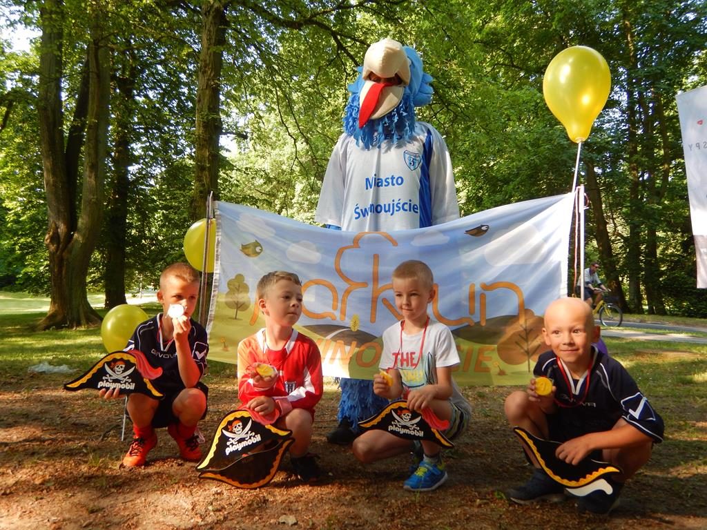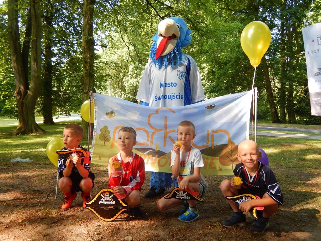 Jak się później okazało były to zaprzyjaźnione zwierzaki z parkrunowej ferajny oraz zaprzyjaźniona maskotka z klubu piłkarskiego Flota, które przyszły pomóc wszystkim chętnym dzieciom w swojej biegowej przygodzie z okazji Dnia Dziecka w ramach Parkrun 99. Wszystkie dzieci, które zdecydowały się aktywnie rozpocząć weekendowy poranek mogły wziąć udział w specjalnie przygotowanym dla nich biegu, a że przyszła ich dość spora gromadka, bo 50-cio osobowa ekipa , trzeba było je podzielić na dwie grupy startowe. Ale to nieważne ile dzieciaczków wystąpiło i które było najszybsze, bo dzisiaj wszyscy byli zwycięzcami i byli najlepsi. Każdy otrzymał okolicznościowy dyplom, słodkie medale i drobne upominki od naszych partnerów.