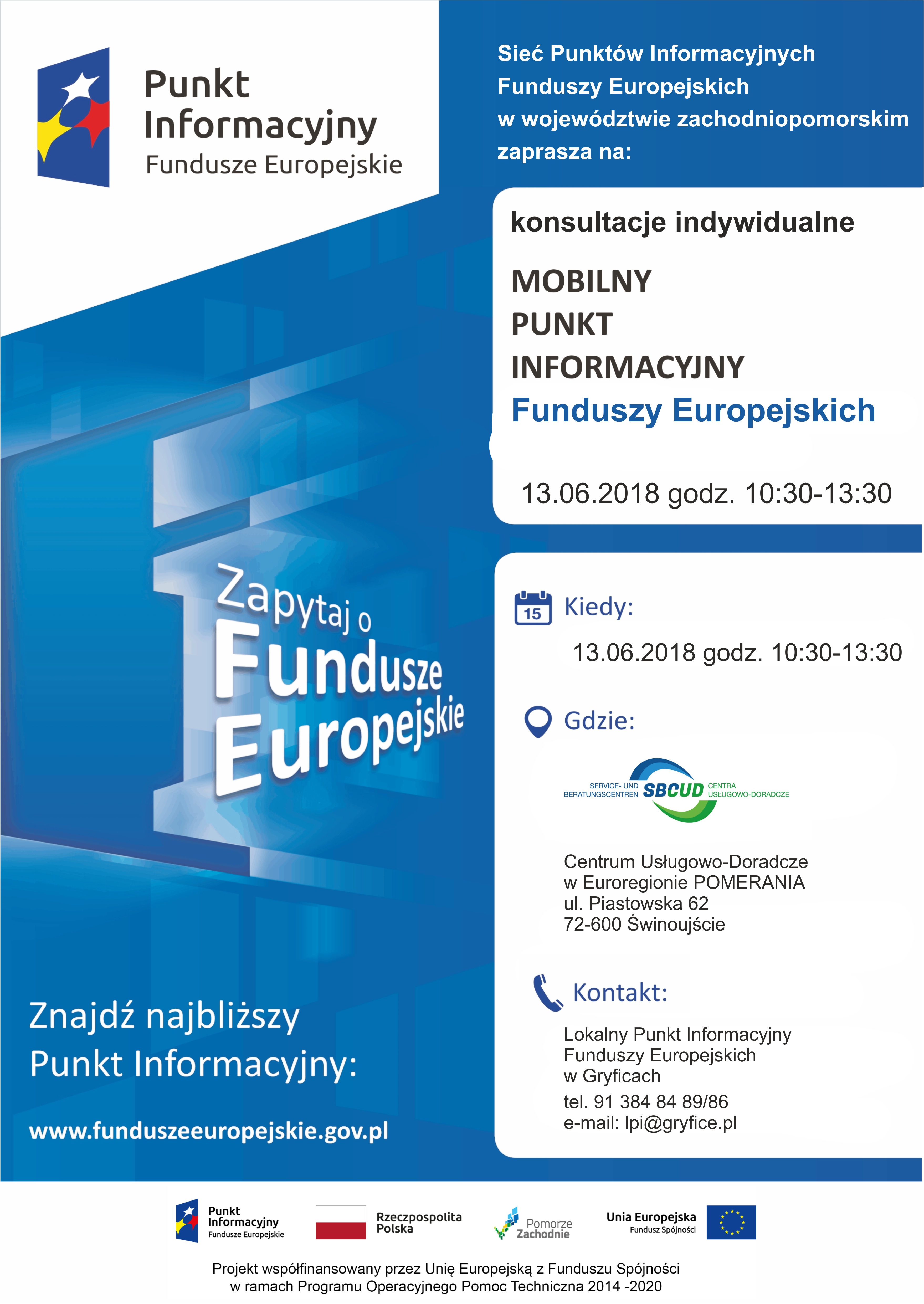 Szanowni Państwo, uprzejmie informujemy, że w siedzibie Centrum Usługowo- Doradczego przy ul. Piastowskiej 62 uruchomiony został stały dyżur Punktu Informacyjnego Funduszy Europejskich w ramach Mobilnego Punktu Informacyjnego.