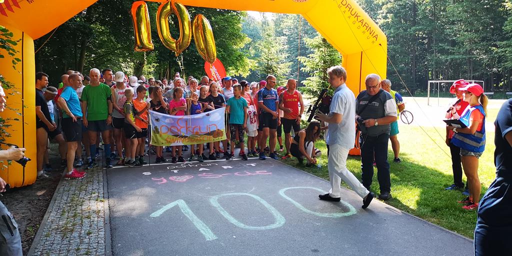 Dzisiaj parkowy bieg był wyjątkowy dla biegaczy i organizatorów. Od 9 lipca 2016 roku nasza biegowa impreza odbyła się po raz setny! Przy pięknej pogodzie, miłej atmosferze, imponującej liczbie biegaczy -157 i smacznym poczęstunku po biegu rozpoczął się bieg, marsz i marszobieg dla wszystkich chętnych. Zwycięzcami są wszyscy, ale Ci, którzy „przycisnęli gaz do dechy” najmocniej, byli wśród panów: Wojciech Dylik (19.39), Jacek Giba (20.03), Krzysztof Walkowiak (20.18), a wśród pań: Agnieszka Załoga Sikorska (22.26), Aleksandra Keplin (23.06) i Monika Murawska (24.28).