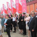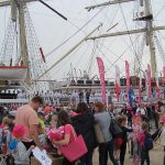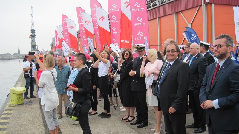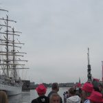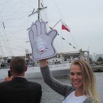 Na Nabrzeżu Bułgarskim szczecińskiego portu,  przy burcie żaglowca,  zgromadził się ok. godz. 10-ej w piątek 15 bm. spory tłum żegnających, w tym miłośników i przyjaciół żagli i żaglowca, rodziny załogantów, a także oficjele i goście odbywających się tuż obok światowych Dni Morza i 6. Kongresu Morskiego. Wiele osób miało specjalne pożegnalne gadżety fundowane przez sponsorów, w tym „łapy”, kapelusze plażowe i trąbki. Po komendzie „Oddać cumy!” rozległy się gorące brawa, „łapy” poszły w górę, załoganci opowiedzieli z pokładu pożegnalną „falą” (na zdjęciach). Holowniki ustawiły żaglowiec w kierunku Bałtyku i Atlantyku, w kierunku dalekiego świata…
