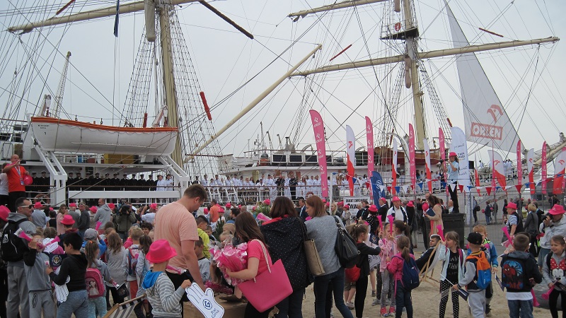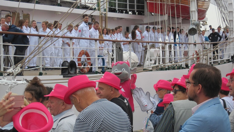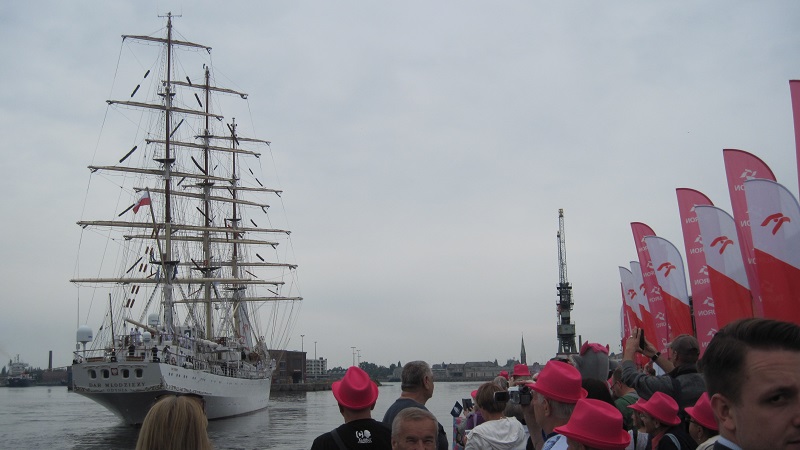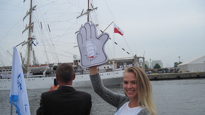 Na Nabrzeżu Bułgarskim szczecińskiego portu, przy burcie żaglowca, zgromadził się ok. godz. 10-ej w piątek 15 bm. spory tłum żegnających, w tym miłośników i przyjaciół żagli i żaglowca, rodziny załogantów, a także oficjele i goście odbywających się tuż obok światowych Dni Morza i 6. Kongresu Morskiego. Wiele osób miało specjalne pożegnalne gadżety fundowane przez sponsorów, w tym „łapy”, kapelusze plażowe i trąbki. Po komendzie „Oddać cumy!” rozległy się gorące brawa, „łapy” poszły w górę, załoganci opowiedzieli z pokładu pożegnalną „falą” (na zdjęciach). Holowniki ustawiły żaglowiec w kierunku Bałtyku i Atlantyku, w kierunku dalekiego świata…