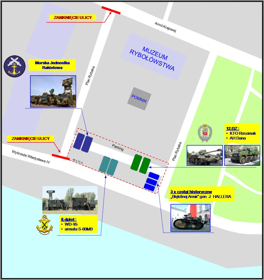 godz. 10.00-20.00 Pokaz statyczny sprzętu Morskiej Jednostki Rakietowej z Siemirowic, 12. Dywizji Zmechanizowanej ze Szczecina, 8. Dywizjonu Przeciwlotniczego z Dziwnowa, grupy rekonstrukcyjnej żołnierzy Błękitnej Armii gen. Józefa Hallera (czołgi FT-17)