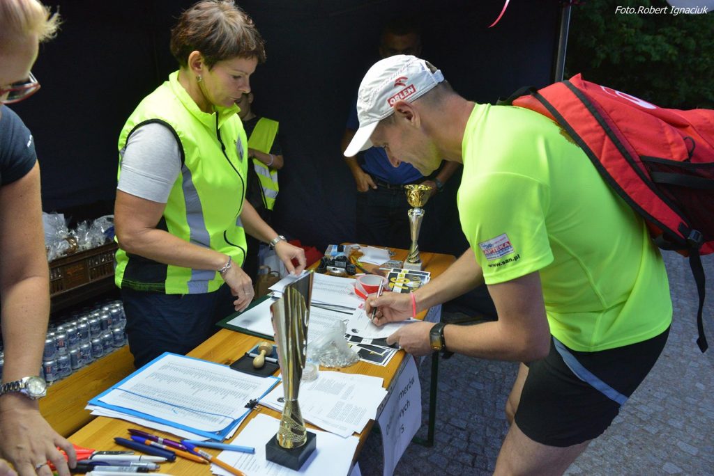 z pochodniami miała ostatnia zawodniczka, z którą przybiegli wolontariusze z punktów orientacyjnych, koleżanki i koledzy wspierający oraz zamykający stawkę rowerzysta.