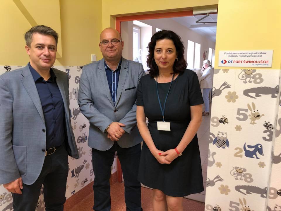 W dniu 27 sierpnia 2018r. o godz. 11.00 nastąpiło uroczyste otwarcie sali zabaw na Oddziale Pediatrycznym Szpitala Miejskiego. Ostatni remont tych pomieszczeń był wykonany 10 lat temu. Dzięki przekazanym środkom finansowym przez OT PORT ŚWINOUJŚCIE S.A. można było nadać temu miejscu nowy charakter. W obecności autora projektu aranżacji Pana Tomasza Sudoła, przedstawicieli spółki OT PORT Pana Grzegorza Sorna i Krzysztofa Gańczy oraz Pana Józefa Hula właściciela firmy realizującej remont jak również gospodarzy obiektu dokonano otwarcia i przekazania do użytkowania pomieszczenia, w którym hospitalizowane dzieci mogą spędzić twórczo czas przebywania w szpitalu. W sali wydzielono strefy edukacyjne dla dzieci starszych i młodszych oraz strefę do gier i zabaw. Osoby dorosłe znajdą tu również miejsce by doglądać swych pociech lub uczestniczyć we wspólnej zabawie. Uroczystości wyjątkowy charakter nadał wystrój wykonany przez Dekoratornię Pani Anny Maciejewskiej. Pyszny tort smakował naszej małej pacjentce Wiktorii uczestniczącej w otwarciu jak i pozostałym gościom.