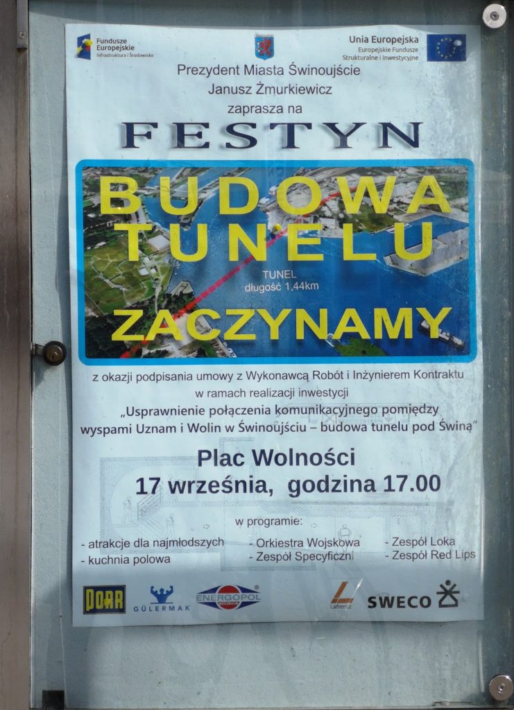 Umowę na „Usprawnienie połączenia komunikacyjnego pomiędzy wyspami Uznam i Wolin w Świnoujściu – budowa tunelu pod Świną” Prezydent Świnoujścia Janusz Żmurkiewicz w imieniu Miasta Świnoujście podpisze z wykonawcą projektu i robót budowlanych – konsorcjum firm Porr SA (lider konsorcjum), Porr Bau GmbH (Austria), Gülermak Agir Sanayi Insaat ve Taahhüt AS (Turcja) oraz Energopol Szczecin SA, Inżynierem Kontraktu – konsorcjum Sweco Consulting z Poznania (Iider konsorcjum) , Sweco GmbH z Bremy i Lafrentz Polska z Poznania.