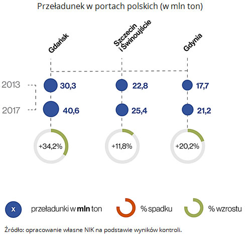 Do żadnego z czterech głównych polskich portów morskich – w Gdańsku, Gdyni, Szczecinie i Świnoujściu – do tej pory nie doprowadzono drogi wysokiej jakości. W najbliższych latach sytuacja się nie zmieni, gdyż nie przewidziano tych inwestycji w Programie Budowy Dróg Krajowych na lata 2014-2023. Najgorzej z drogowym dostępem do portu jest w Gdyni, do którego bram prowadzi droga powiatowa o ograniczonej nośności. Lepsze perspektywy ma kolej, gdzie w najbliższych latach (2019-2020) zaplanowano modernizację stacji kolejowych obsługujących główne porty morskie. Problem w tym, że roboty mają ruszyć w tym samym czasie, co zdaniem Izby może doprowadzić okresowo do znacznych ograniczeń w transporcie kolejowym do portów. NIK zaznacza, że pilnego rozwiązania wymaga problem z dostępem do portu w Szczecinie, gdzie nie pogłębiano odpowiednio toru wodnego Świnoujście – Szczecin z powodu braku pieniędzy z budżetu państwa.