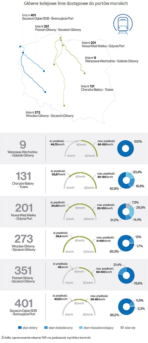 W przypadku każdej z trzech zaplanowanych inwestycji, które swym zakresem obejmują modernizacje stacji obsługujących cztery porty morskie, do czasu zakończenia kontroli NIK (tj. 30 września 2017 r.) zawarto jedynie umowy na przygotowanie dokumentacji projektowej wraz z pełnieniem nadzoru autorskiego. Natomiast prace budowlane w ramach każdej z tych trzech inwestycji zaplanowano aktualnie na lata 2019-2020. Tymczasem na stacjach obsługujących porty morskie zbyt mało torów stacyjnych było zelektryfikowanych, prawie 25 proc. torów było wyłączonych z użytkowania, a dodatkowo część pozostałych torów była zajęta przez nieczynny tabor wagonowy, co w konsekwencji powodowało ograniczenia w przepustowości tych stacji. Ponadto PKP PLK S.A. na ten sam okres, tj. na lata 2019-2020, zaplanowała realizację prac budowlanych w ramach ww. trzech inwestycji.