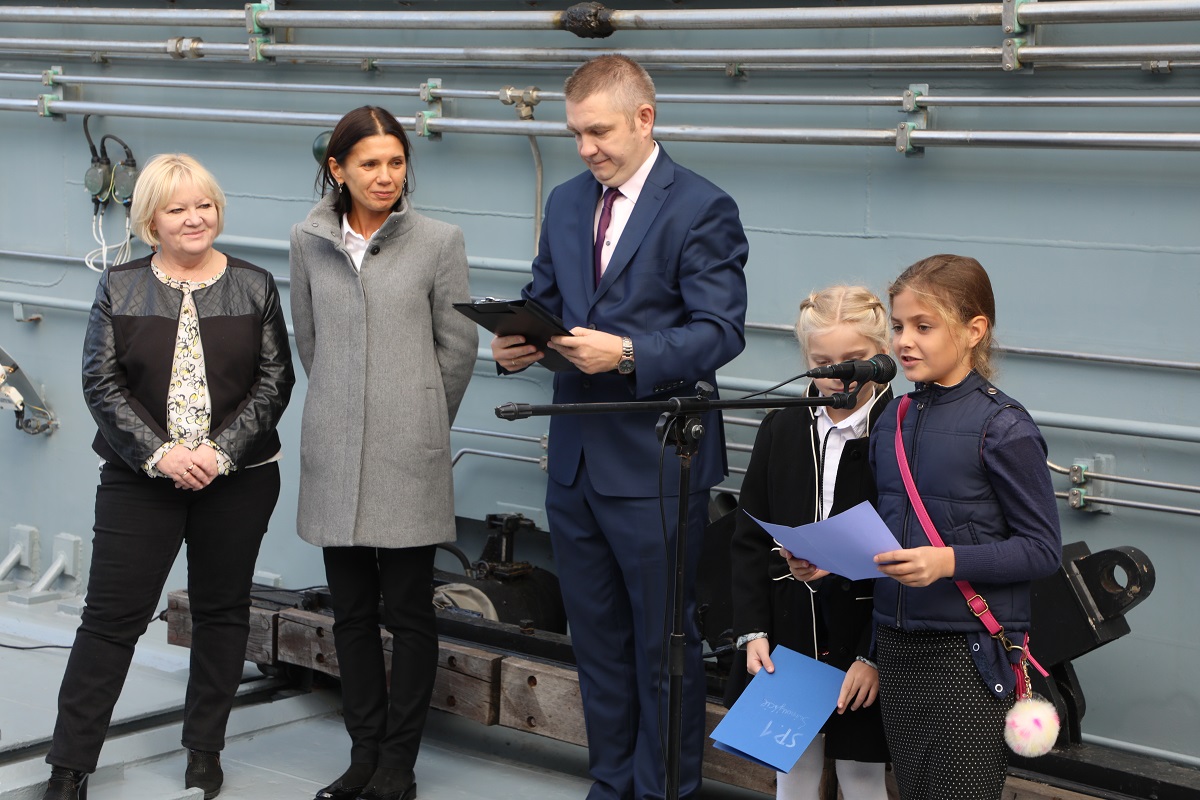 Przyrzeczenie sumiennej nauki oraz dbałości o dobre imię szkoły i ucznia przypieczętowane zostało dotknięciem ramion uczniów kordzikiem oficerskim Marynarki Wojennej. Na pokładzie okrętu dzieci klas pierwszych stały się uczniami. Uroczystość poprowadził oraz dokonał aktu pasowania zastępca dowódcy okrętu ORP Gniezno por. mar. Cyprian Nosewicz. Uczniowie ślubowali na sztandar szkoły sumienną naukę i rzetelne wywiązywanie się z obowiązków uczniowskich. Ślubowanie złożyli także rodzice przyrzekając, że wspierać będą swoje dzieci w wypełnianiu szkolnych powinności.
