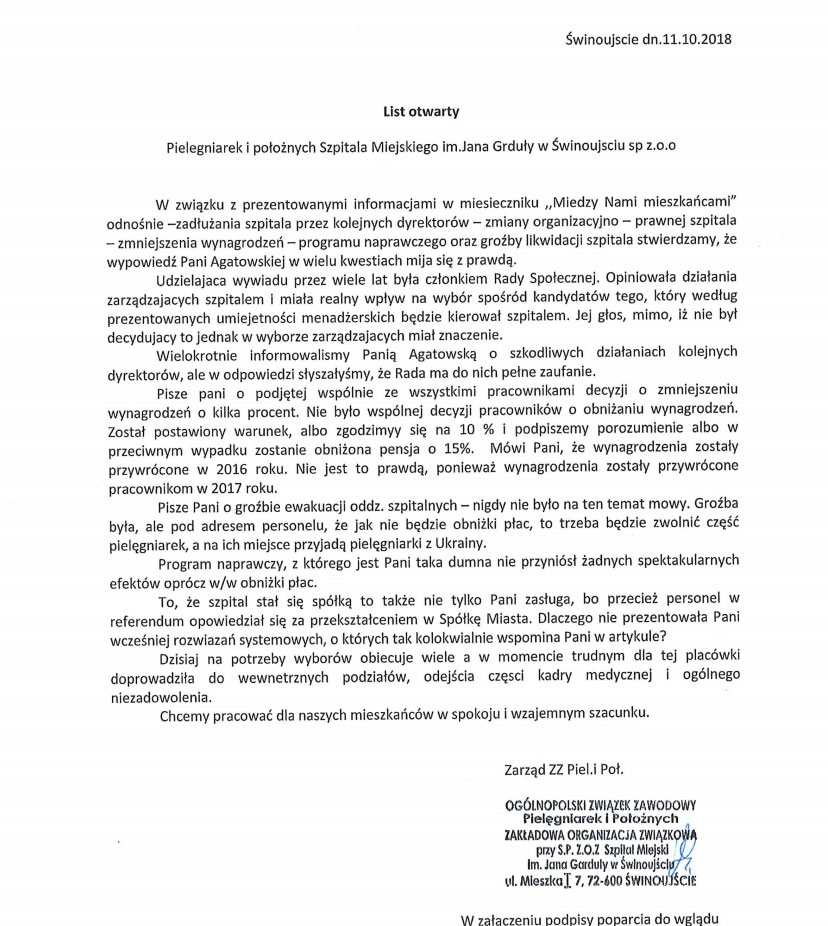 „Odnosząc się do Listu Otwartego z dn. 11.10.2018 r. zaprezentowanego przez Zakładową Organizację Związkową działającą przy SP ZOZ działającą przy Szpitalu Miejskim w Świnoujściu uprzejmie informuję, że jeśli w mojej wypowiedzi zaprezentowanej w Biuletynie „Świnoujście. Między Nami Mieszkańcami” znajdowały się treści nieprawdziwe, to winny podlegać sprostowaniu prasowemu zgodnie z Prawem Prasowym. Takie Sprostowanie do Redakcji nie trafiło.