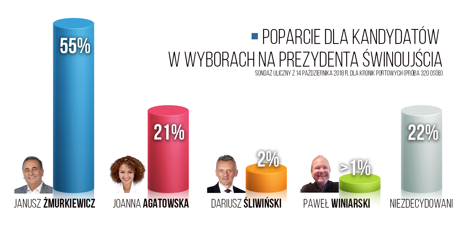 Według najnowszego sondażu przeprowadzonego dla Kronik Portowych starcie wygrałby Janusz Żmurkiewicz, na którego głos chce teraz oddać 55 proc. ankietowanych. Jego konkurentka Joanna Agatowska może liczyć na 21 proc. głosów. Dariusz Śliwiński ma poparcie 2 proc., a Paweł Winiarski mniej niż 1 proc. Wśród osób ankietowanych 22 proc. wciąż jeszcze nie podjęło ostatecznej decyzji, którego z kandydatów do najważniejszego urzędu w magistracie poprze w dniu 21 października b.r.