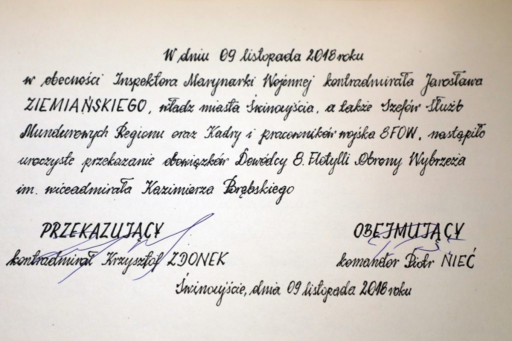 Uroczystość rozpoczęła się o godzinie 12:00. W jej trakcie, dotychczasowy dowódca kontradmirał Krzysztof Zdonek przekazał dowodzenie komandorowi Piotrowi Nieć. Meldunki o zdaniu i przyjęciu obowiązków przyjął Inspektor Marynarki Wojennej kontradmirał Jarosław Ziemiański. Kontradmirał Krzysztof Zdonek po ponad dwóch i pół roku dowodzenia świnoujską flotyllą został wyznaczony decyzją Ministra Obrony Narodowej na stanowisko Szefa Zarządu Morskiego – Zastępcę Inspektora Marynarki Wojennej. Kontradmirał Ziemiański w swojej przemowie podziękował ustępującemu dowódcy za wzorowe dowodzenie flotyllą oraz dotychczasową służbę na wszystkich stanowiskach służbowych w strukturach 8.FOW, jednocześnie życząc dalszych sukcesów. Obejmującemu dowodzenie komandorowi Piotrowi Nieć Inspektor złożył życzenia wszelkiej pomyślności na obejmowanym dzisiaj stanowisku oraz satysfakcji z pełnienia służby w 8. Flotylli Obrony Wybrzeża.