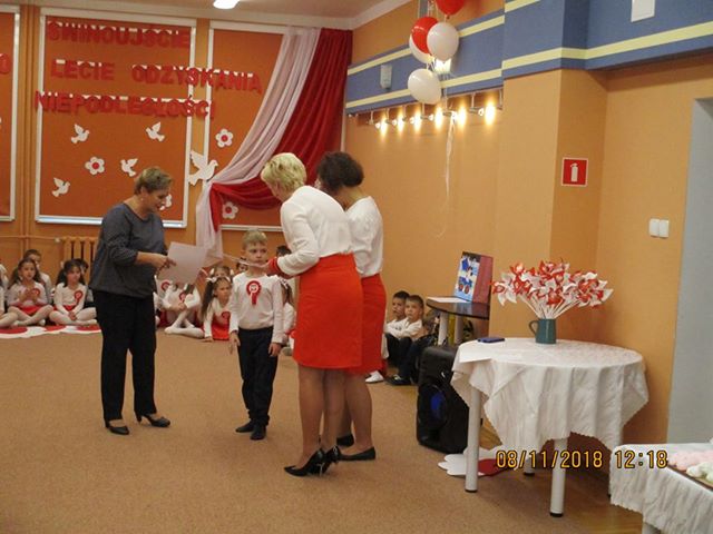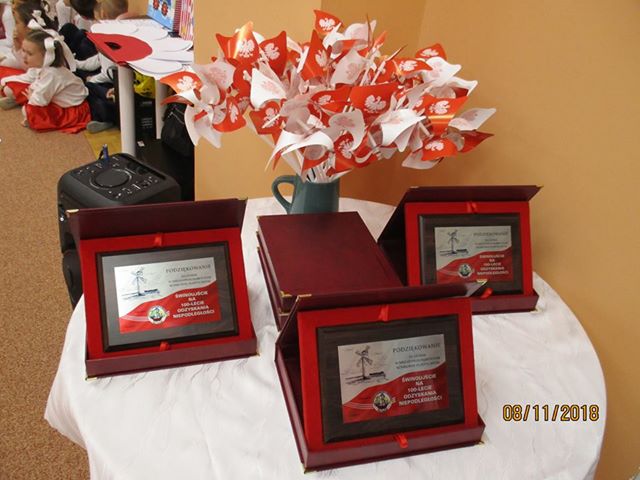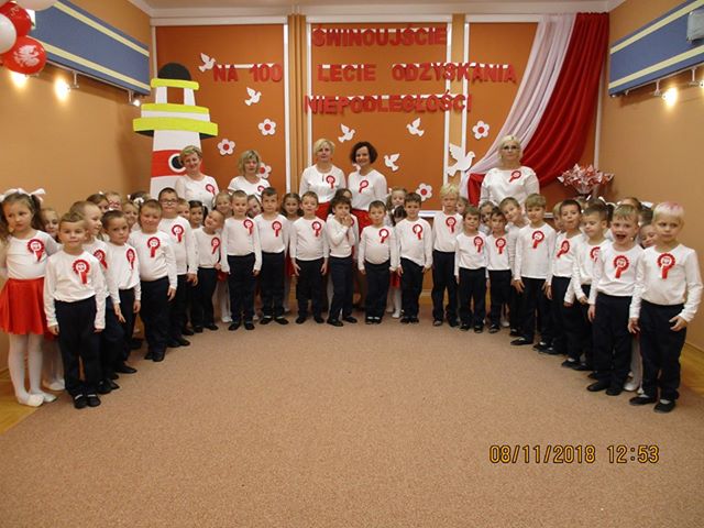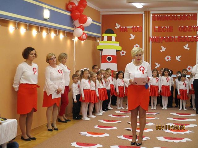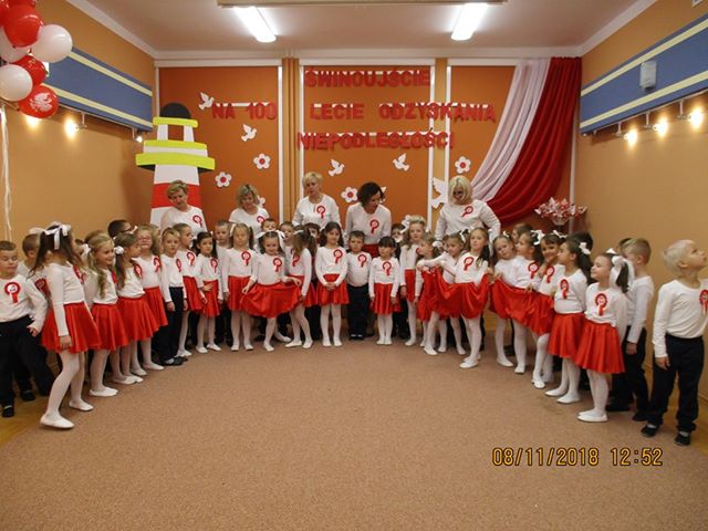 Z tej okazji w Przedszkolu Miejskim nr 3 ,, Pod Żaglami” został zorganizowany międzyprzedszkolny konkurs plastyczny ,, Świnoujście na 100- lecie odzyskania niepodległości” adresowany do dzieci świnoujskich przedszkoli. Celem konkursu było m.in. kształtowanie poczucia przynależności społecznej, wspólnoty narodowej oraz postawy patriotycznej rozwijanie i kształtowanie wyobraźni plastycznej i kreatywności dziecka, budzenie zainteresowania różnorodnością technik plastycznych a przede wszystkim uczczenie w naszym mieście 100 rocznicy odzyskania niepodległości przez Polskę. Na konkurs wpłynęło 37 prac dzieci 5 i 6 – letnich. Rozstrzygnięcie konkursu  i otwarcie wystawy odbyło się bardzo uroczyście w Bibliotece Miejskiej im Stefana Flukowskiego. Na tą uroczystość została zaproszona Naczelnik Wydziału Edukacji Janina Śmiałkowska,  dyrektorzy świnoujskich przedszkoli oraz laureaci konkursu czyli dzieci przedszkolne. Dzieci z grupy „Delfinki” i „Żeglarze”  z przedszkola ,, Pod Żaglami” ubrane w biało czerwone stroje przedstawiły krótką część artystyczną wprowadzając odpowiedni nastrój uroczystości. Po części artystycznej nastąpiło rozdanie nagród,  które ufundował hotel „Trzy Wyspy”. Przedszkola biorące udział w konkursie otrzymały okolicznościowe grawertony ufundowane przez Radę Rodziców przy Przedszkolu Miejskim nr 3. Miłą niespodzianką dla wszystkich był słodki poczęstunek ufundowany przez hotel „Radisson Blu” w Świnoujściu. Wszystkim uczestnikom biorącym udział w konkursie oraz  sponsorom nagród i poczęstunku serdecznie dziękujemy.