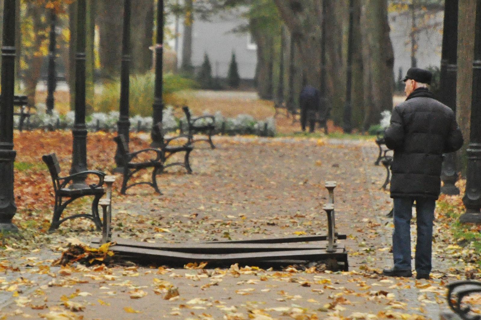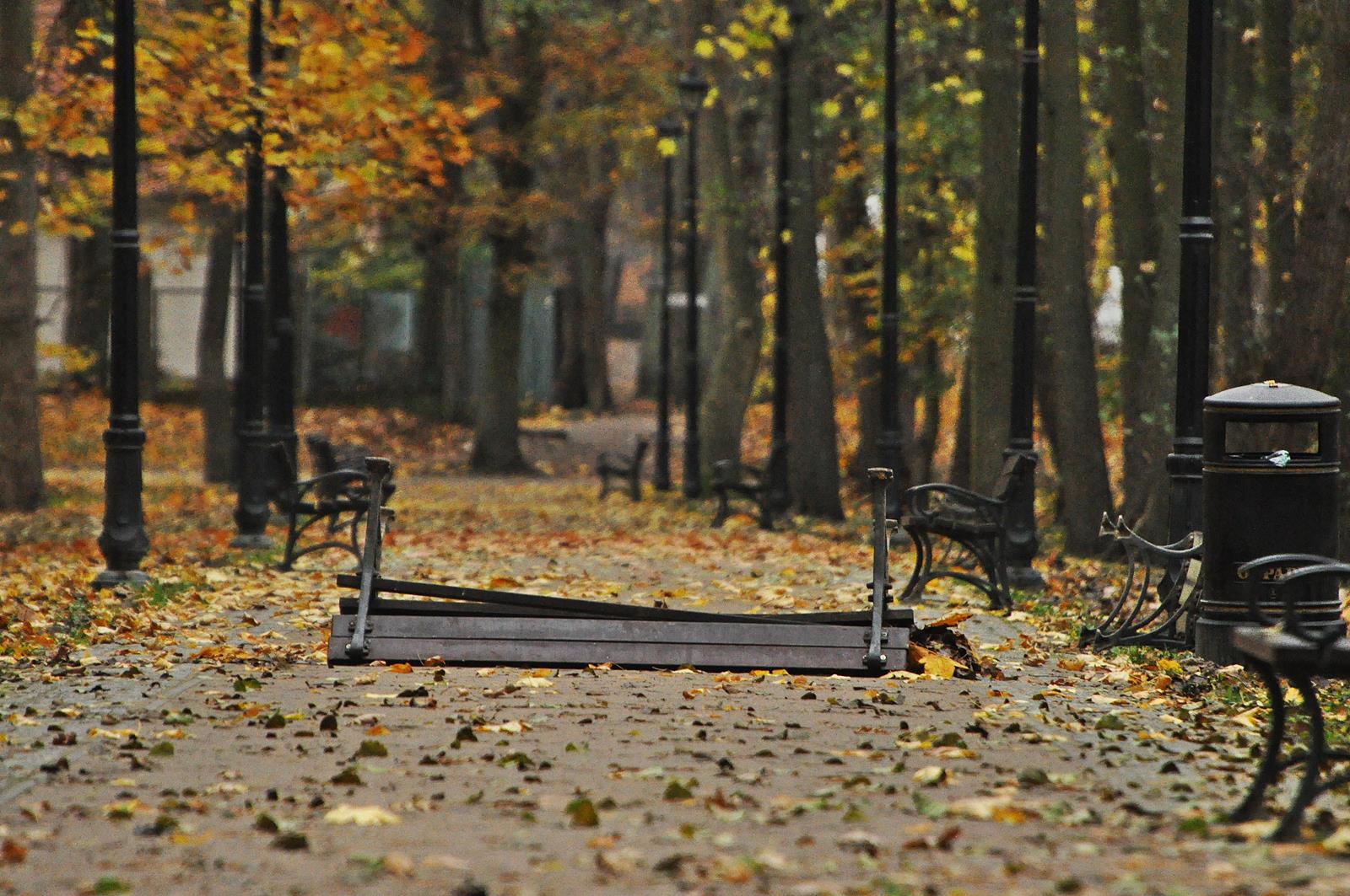 taka mała grupka ludzi z dziecmi idąc nad morze, podnosiła te wywalone ławki….