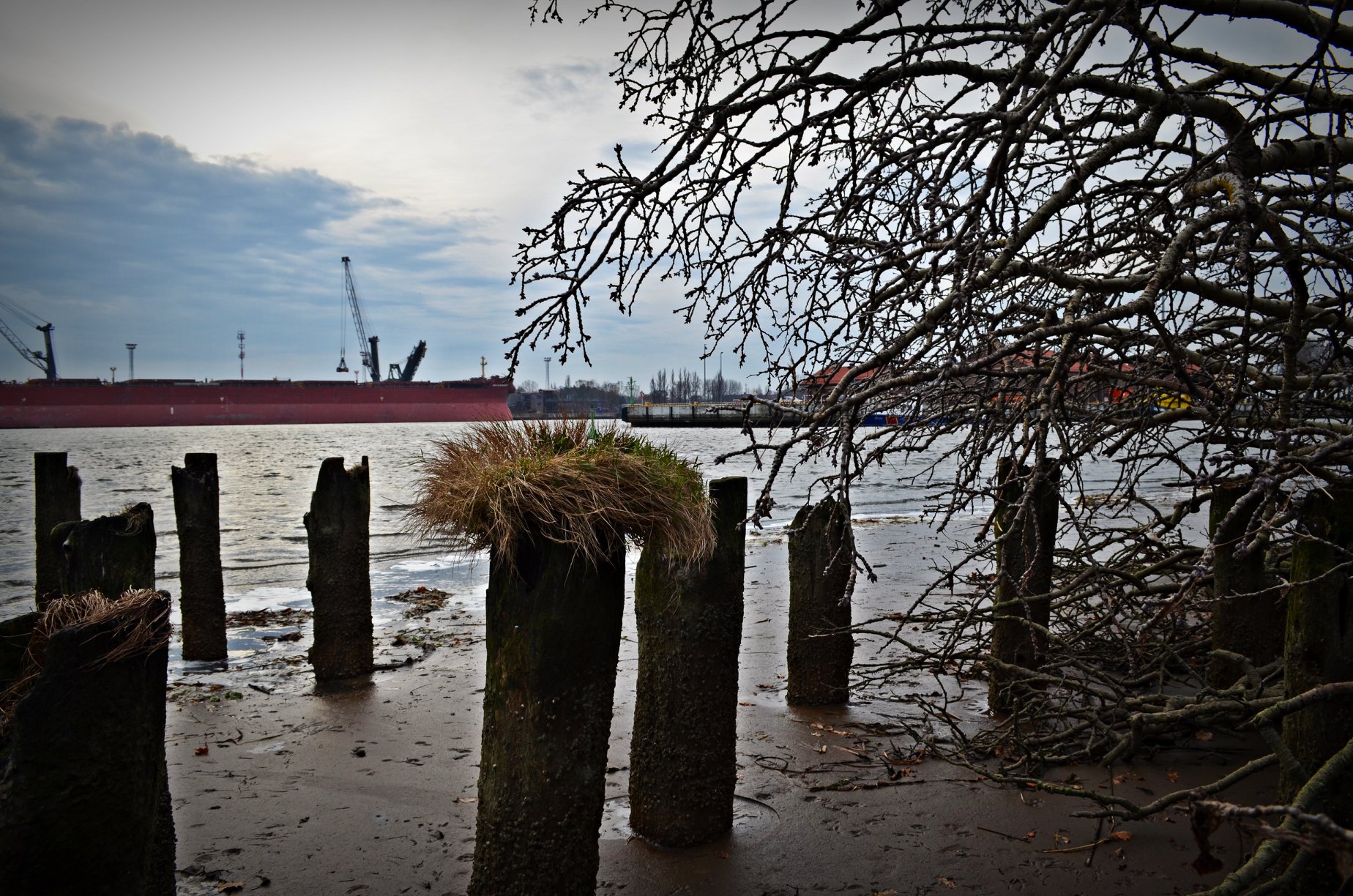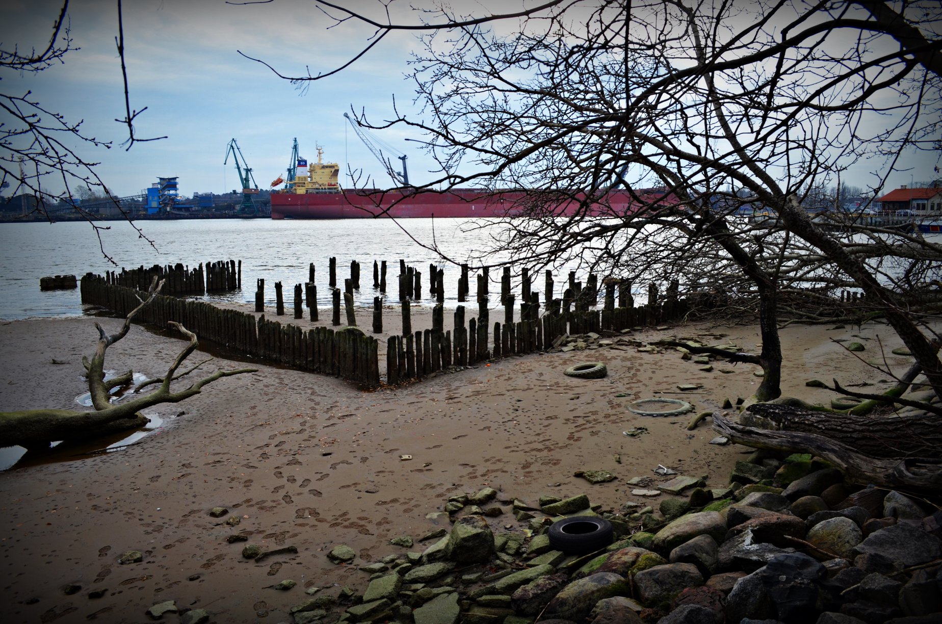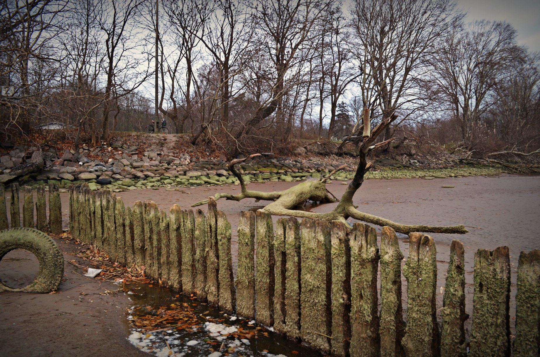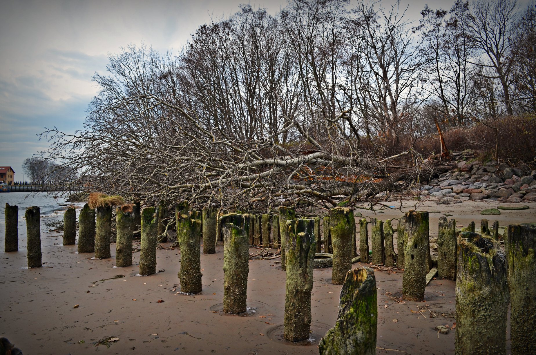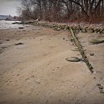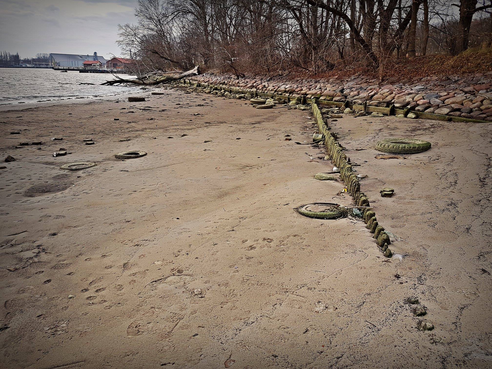 Niski stan wody odkrył drewniane umocnienia falochronu [ZDJĘCIA]