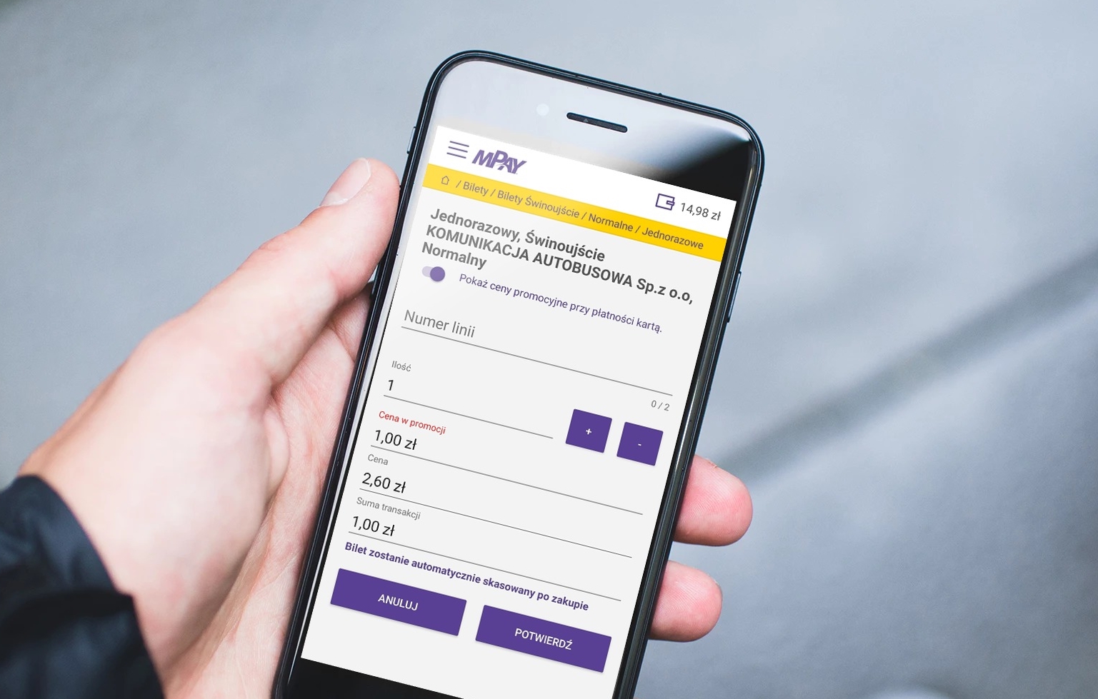 mPay to darmowa aplikacja na telefony komórkowe, z której można korzystać w świnoujskich autobusach od końca lipca 2018 r. Rozwiązanie ułatwia dokonywanie wielu codziennych płatności życia codziennego, pozwalając m.in. kupować bilety komunikacji miejskiej bez stania w kolejkach czy szukania otwartego punktu sprzedaży. W aplikacji na telefonie są one dostępne przez całą dobę. Dodatkowo, dzięki trwającej do końca roku wspólnej akcji mPay i Mastercard, wybrane bilety można kupować za 1 zł.