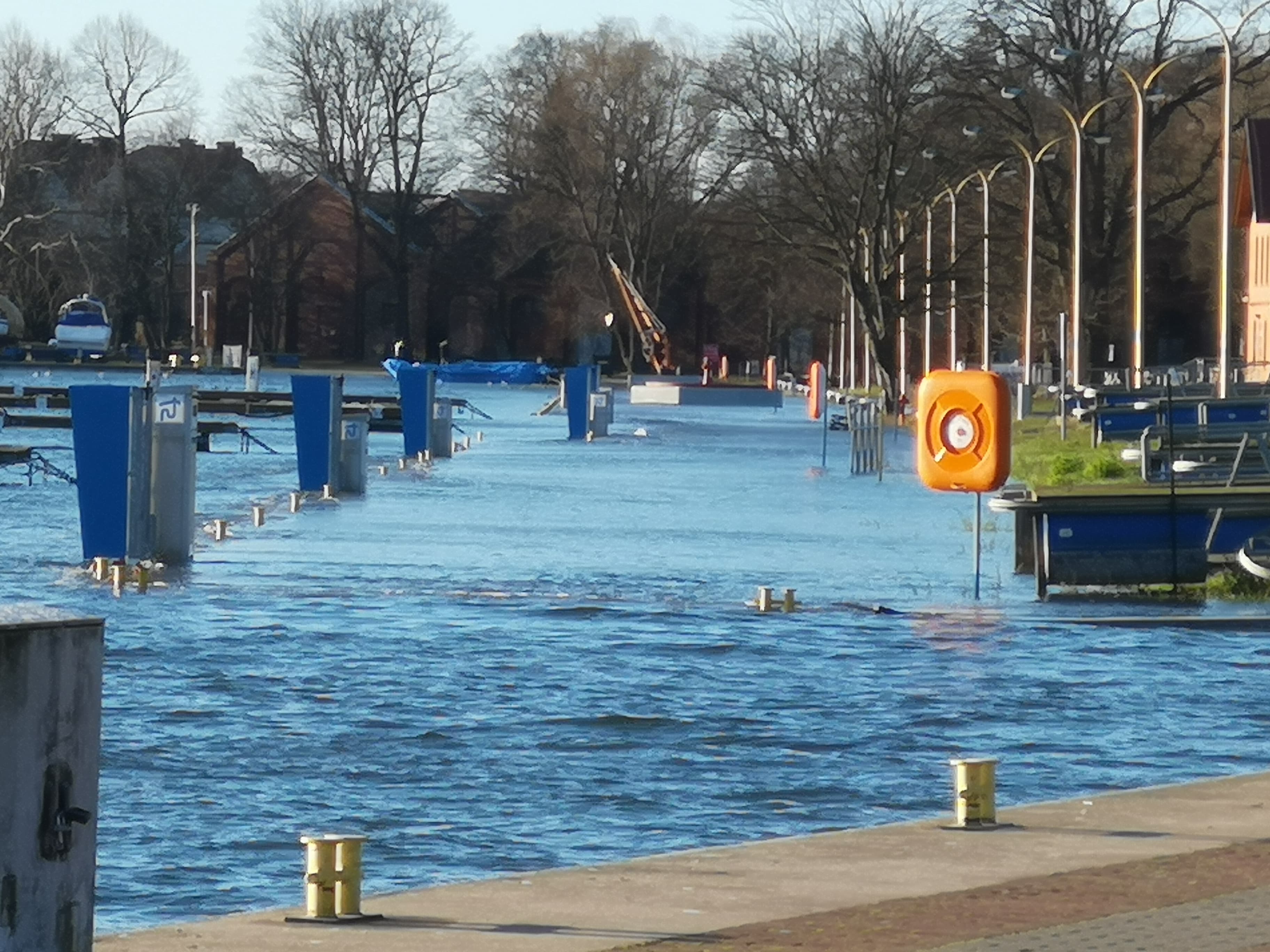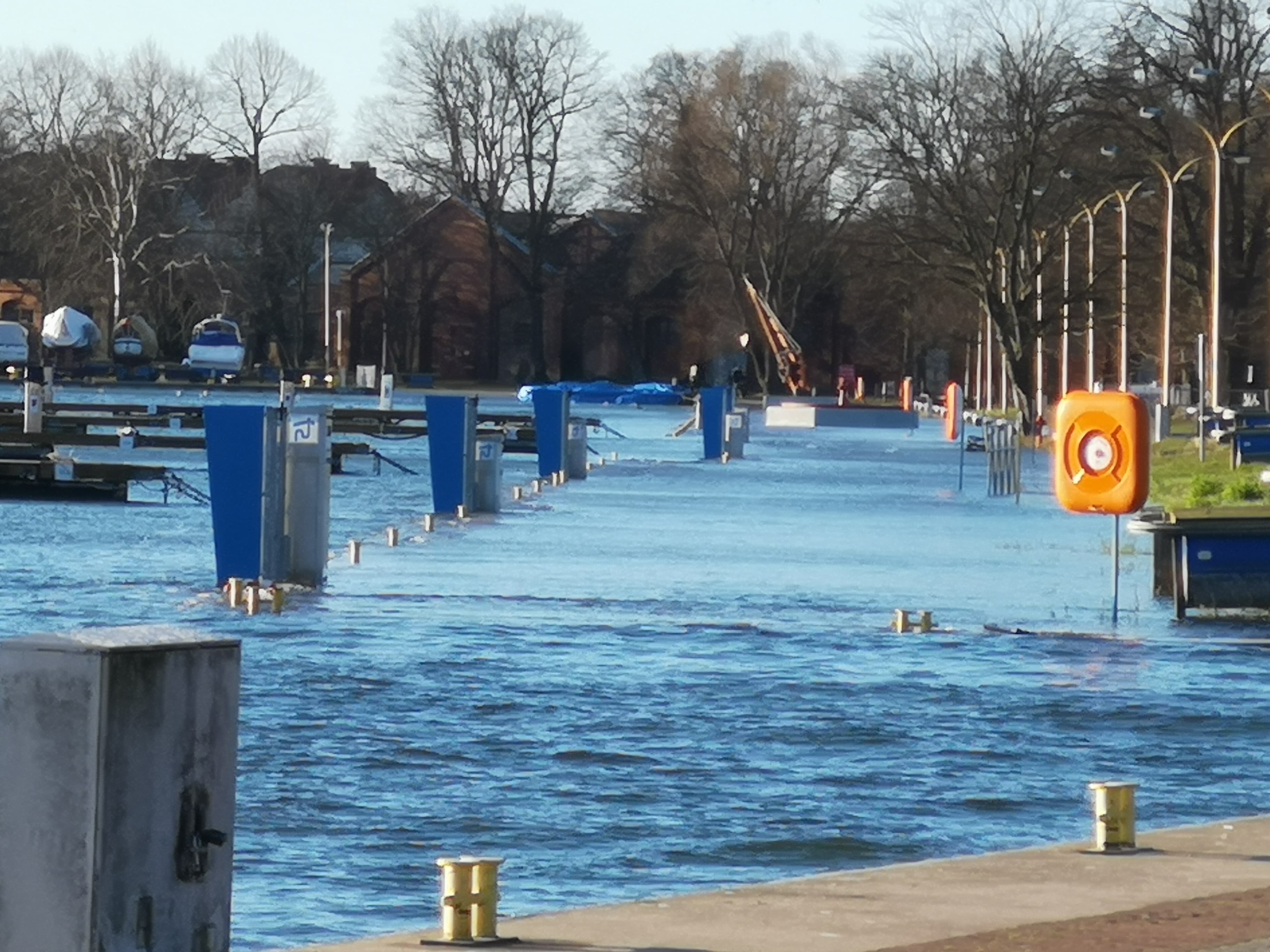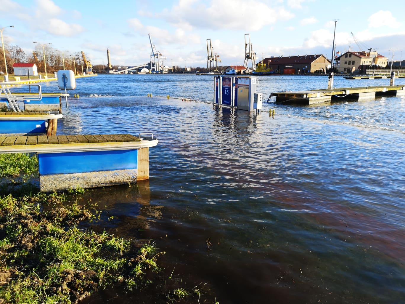 W Basenie Północnym, czyli marinie, poziom wody niemal zrównał się z nadbrzeżem. Fale wylewają się na portowe nabrzeże. Na szczęście nie ma żadnego zagrożenia dla jachtów, bowiem wszystkie o tej porze roku są zimowane na lądzie.
