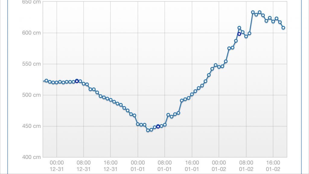 O godzinie 19.00 stan wody wynosił 608 centymetrów. Wciąż jednak wieje wiatr z porywistymi podmuchami, który napycha wodę do portu. Woda musi spaść poniżej 580 centymetrów, aby odwołano stan alarmowy.  Meteorolodzy informują, że utrzymywanie stanów alarmowych i ostrzegawczych w pasie wybrzeża może potrwać do wieczornych i nocnych godzin do piątku 4 stycznia 2019 r.