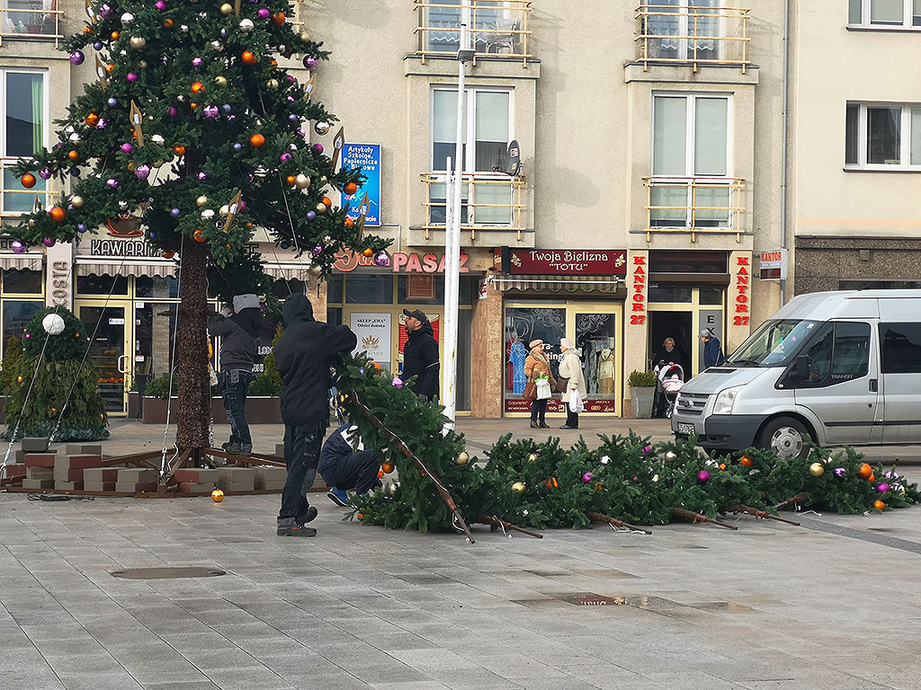 Rozpoczęto od  choinki ustawionej w samym sercu miasta. Zdemontowano także pozostałe ozdoby na placu Wolności. Wkrótce znikną z latarni ulicznych świetlne gwiazdki, księżyce i śnieżynki.