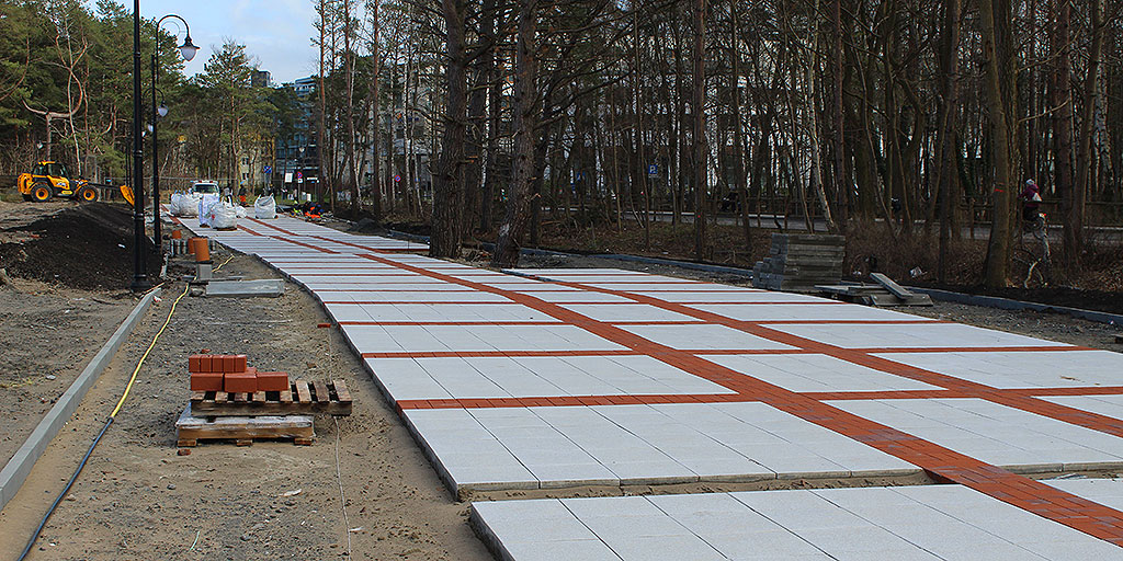 Jesteśmy coraz bliżej spacerów po nowej promenadzie równoległej do ul. Uzdrowiskowej. Aktualnie wykonawca układa nawierzchnię. Koniec prac – w kwietniu.