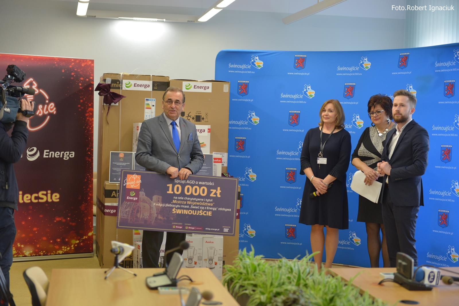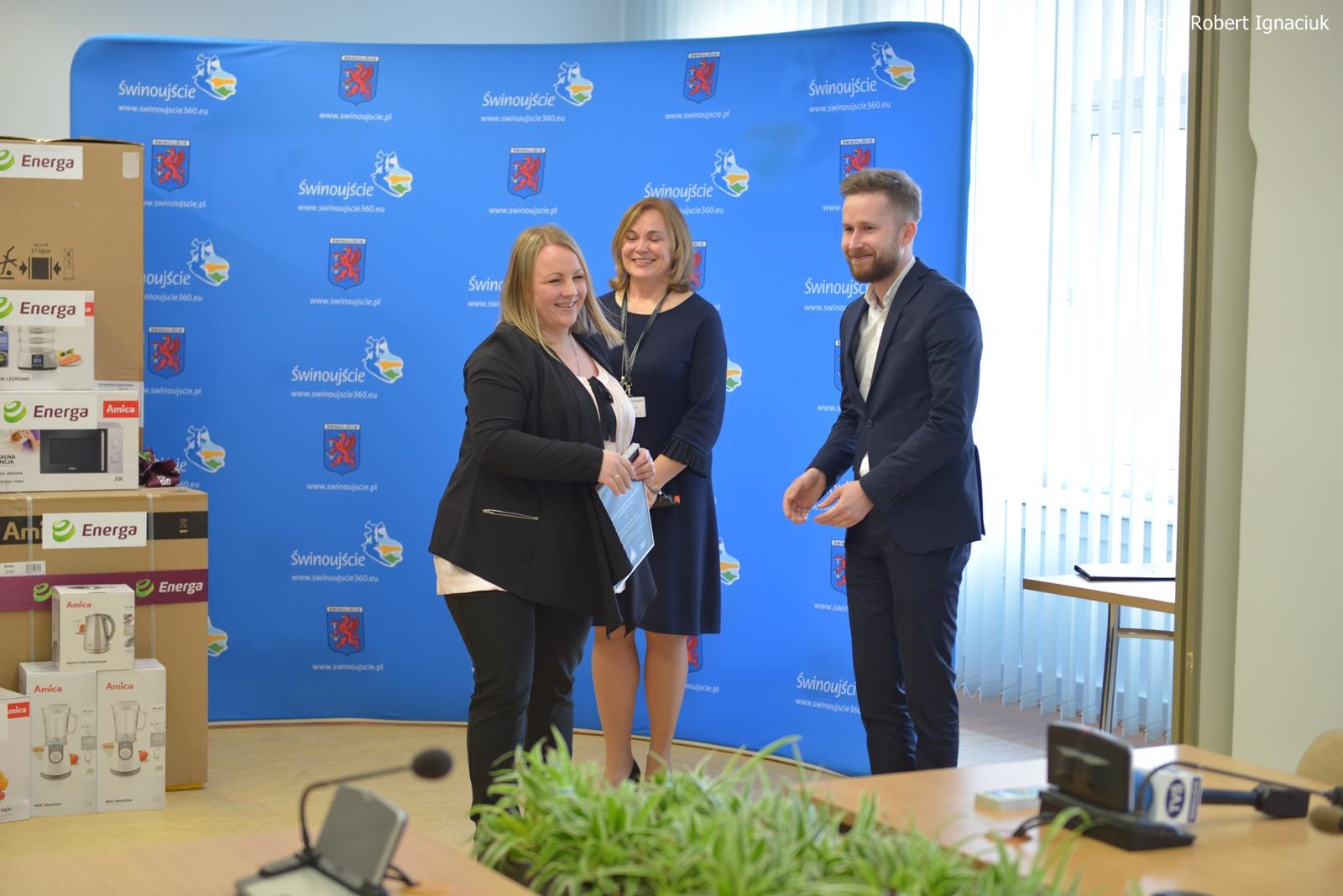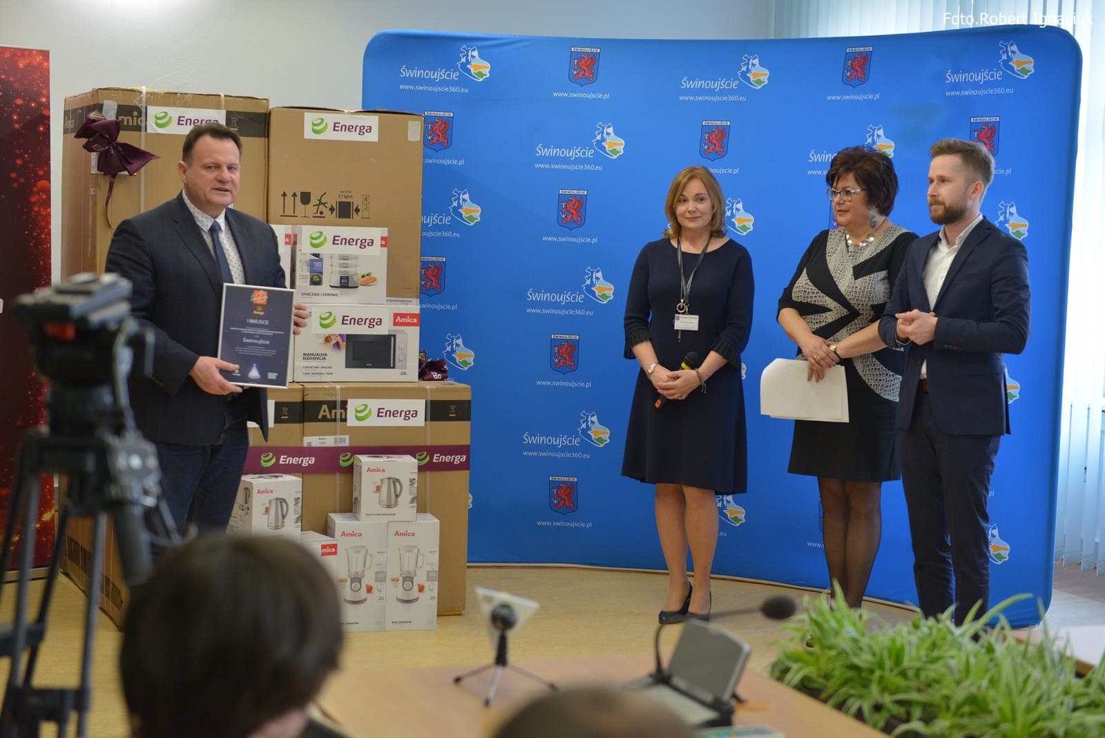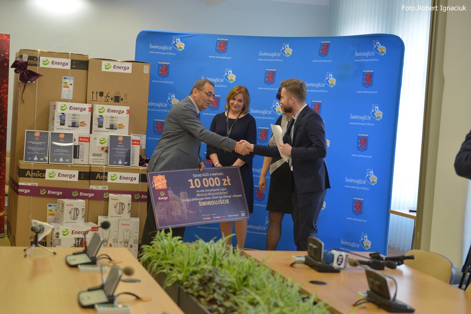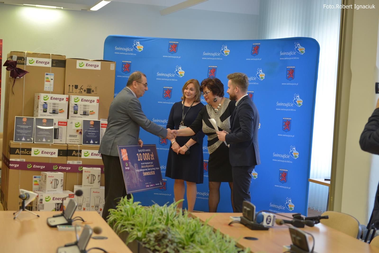 Symboliczny czek i nagrody dziś w urzędzie miasta przekazali prezydentowi Januszowi Żmurkiewiczowi przedstawiciele organizatora  kierownik Zespołu Handlowego Grupa Polska Press Oddział Szczecin Mateusz Dziuk i handlowiec Grupy Polska Press Oddział Szczecin Wiesława Sowa.