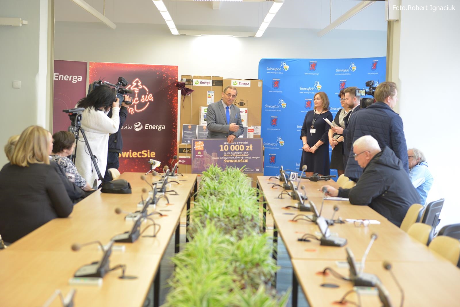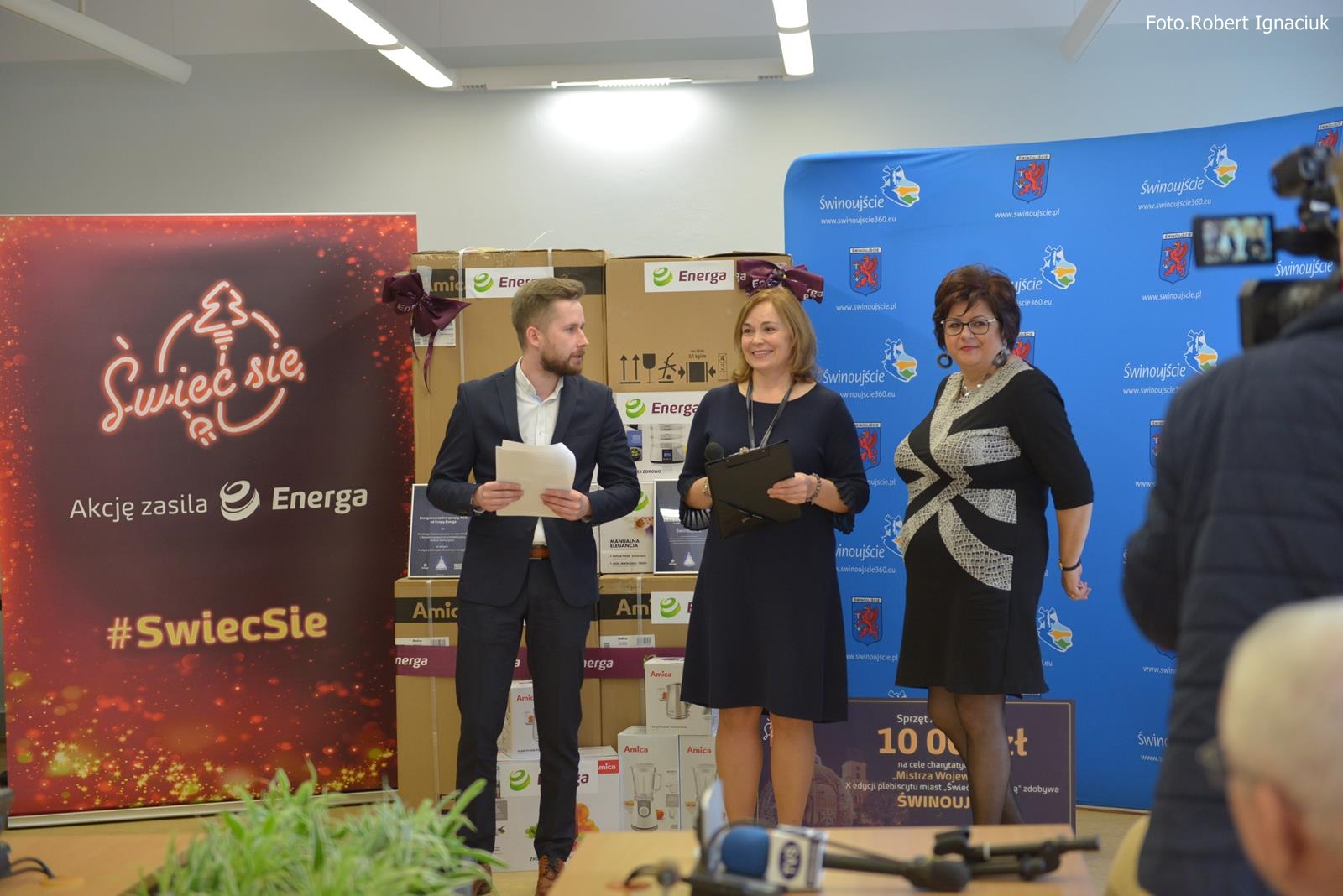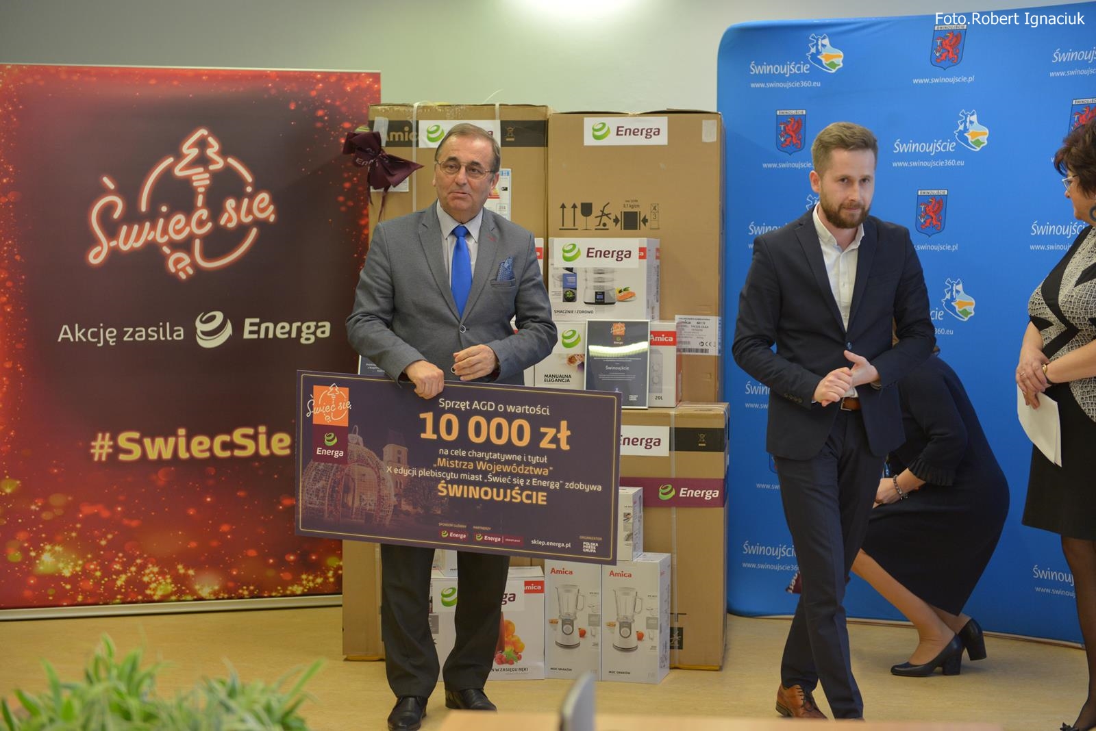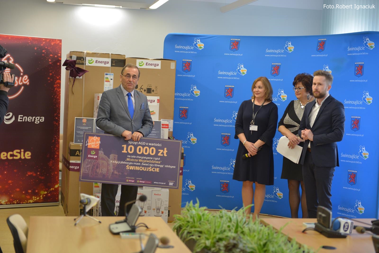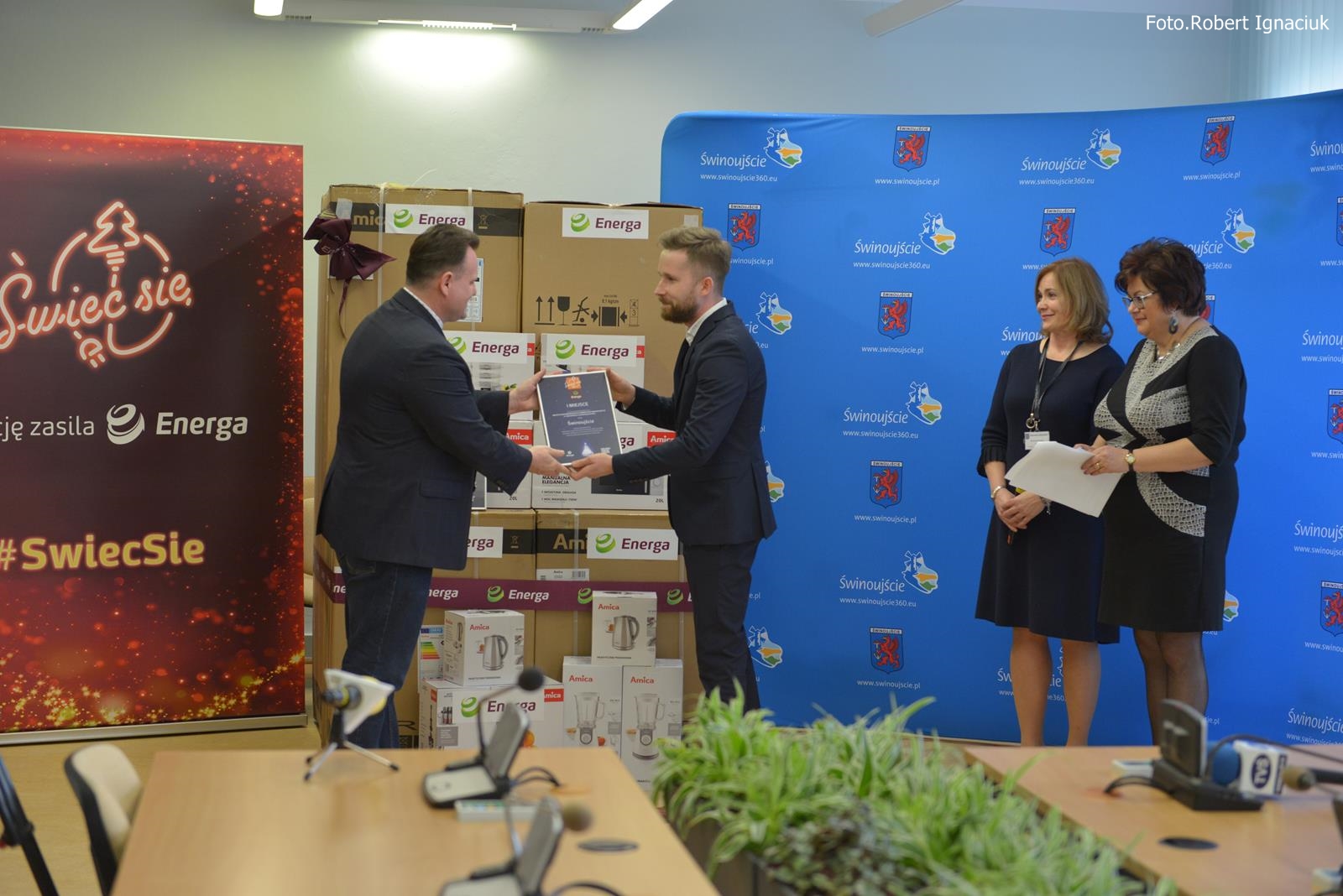 Symboliczny czek i nagrody dziś w urzędzie miasta przekazali prezydentowi Januszowi Żmurkiewiczowi przedstawiciele organizatora  kierownik Zespołu Handlowego Grupa Polska Press Oddział Szczecin Mateusz Dziuk i handlowiec Grupy Polska Press Oddział Szczecin Wiesława Sowa.