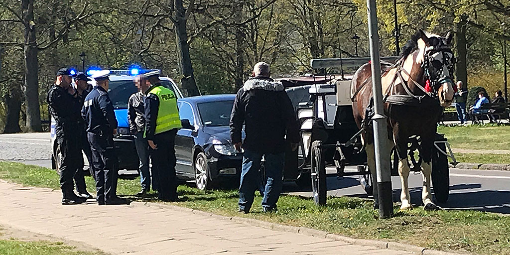 Kodeks przewiduje taki znak jak , B- 8 Zakaz wjazdu pojazdów zaprzęgowych. No ludzie toczy się to w najbardziej ruchliwych miejscach w mieście .. Polecam toczyć się od ronda do samej plaży za bryczką bo niemiec zwiedza okolice