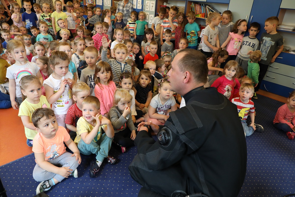 Nurkowie-minerzy z 12.Dywizjonu Trałowców odwiedzili dzieci z Przedszkola Miejskiego nr 3 „Pod Żaglami” w Świnoujściu. Przedszkolakom zorganizowano pokaz sprzętu oraz zajęcia edukacyjne o zagrożeniach jakie niosą ze sobą niewybuchy.