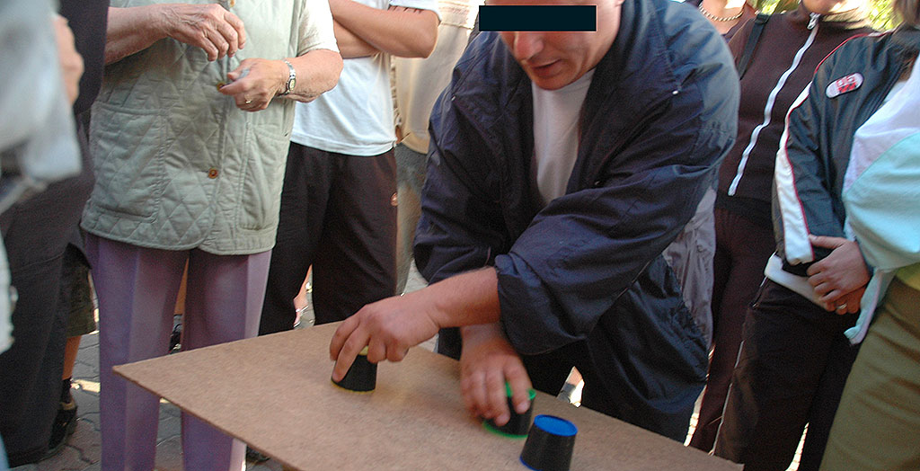 Podstawione osoby wygrywają i głośno afiszują się ze swoją wygraną w celu zwrócenia uwagi przechodniów. Osoby, które wykazały zainteresowanie grą są nachalnie nakłaniane do wzięcia w niej udziału. Kiedy gracz postawi znaczną ilość pieniędzy, jego uwaga podczas przesuwania kubków jest rozproszona przez np. szturchnięcie. Następuje przegrana.