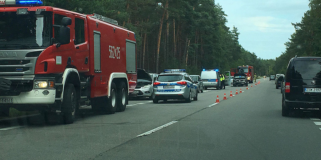 Zderzyły się trzy samochody osobowe. Na miejsce wezwano policję, pogotowie ratunkowe oraz straż pożarną. Policjanci ustalają okoliczności zdarzenia. W trakcie działań, ruch odbywał się wahadłowo.