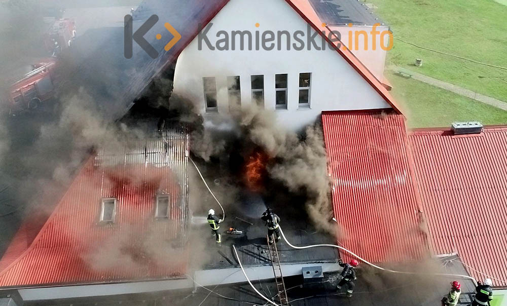 Po przeprowadzonej ewakuacji dzieci oraz kadry, trwa akcja gaśnicza prowadzona przez strażaków z całego Powiatu. Na miejsce sprowadzono dwie drabiny umożliwiające strażakom walkę z żywiołem z góry.