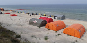 Równolegle z ćwiczeniami na pełnym morzy realizowany był scenariusz zwalczania zanieczyszczeń ropopochodnych, które przedostały się na brzeg morski. Ćwiczenia na plaży realizowane były w rejonie Mrzeżyna i stanowiły część większych ćwiczeń Reagowania Kryzysowego „Gnizado-19”, których organizacją zajął się Wydział Zarządzania Kryzysowego Zachodniopomorskiego Urzędu Wojewódzkiego w Szczecinie. Oprócz ratowników SAR z BSR-ów w Kołobrzegu i Dziwnowie, na plaży w Mrzeżynie obecni byli również liczni przedstawiciele wielu innych służb m.in. Państwowej Straży Pożarnej, Wojska, Policji, Urzędu Morskiego w Szczecinie oraz wolontariusze działający w ramach „Błękitnego Patrolu” organizowanego przez WWF Polska.