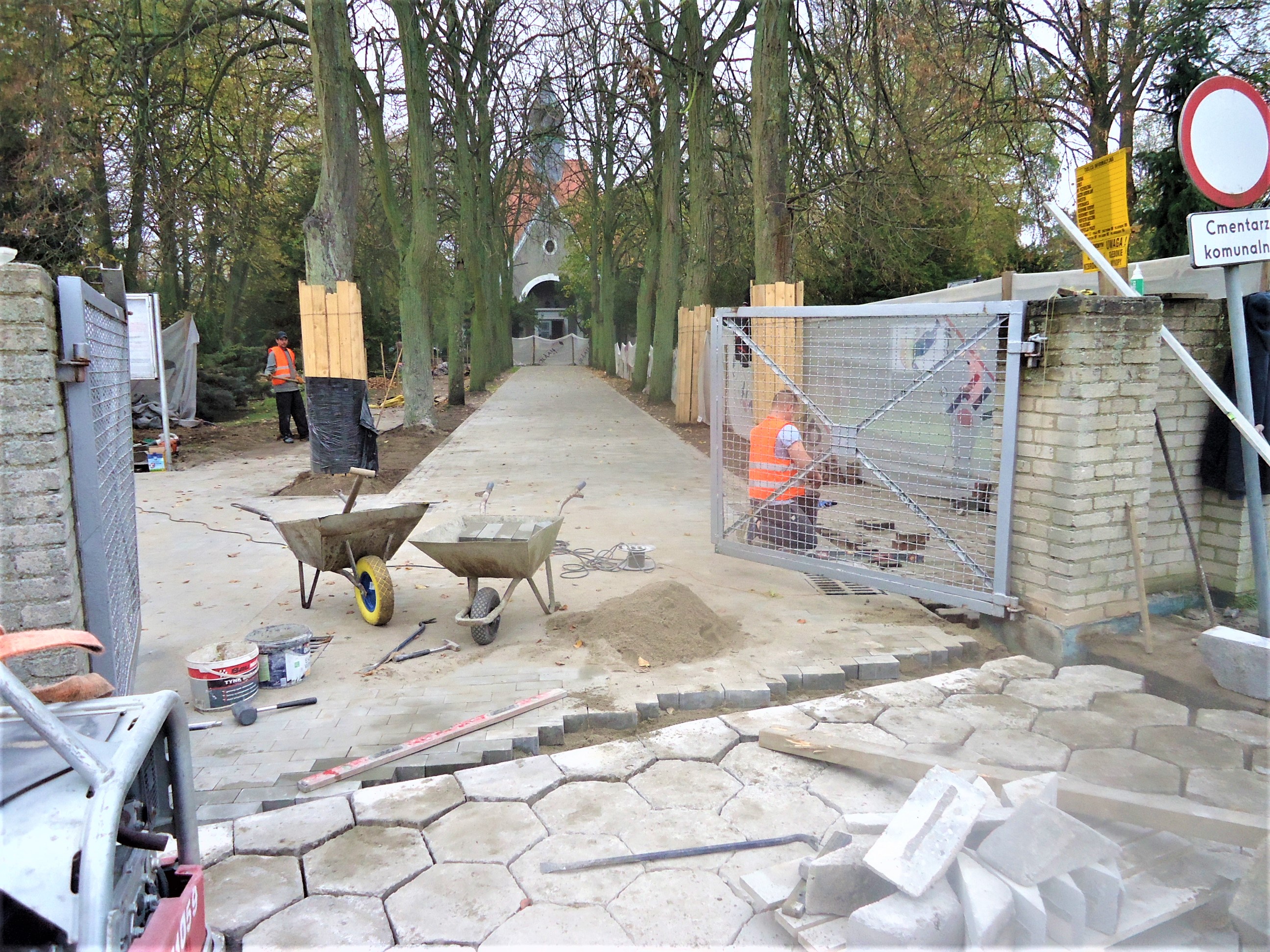 W czwartek popołudniu (24 października), gdy wykonywaliśmy zdjęcia kończono prace na połączeniu alei cmentarnej z wjazdem przed bramą. Brukowano także plac przed budynkiem administracyjnym cmentarza.