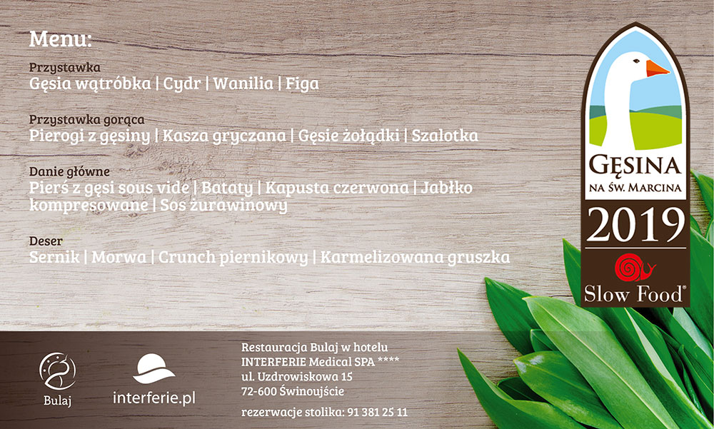 – W Restauracji BULAJ podążamy bardzo mocno za ideą slow food w kulinariach. Właśnie dlatego w tym miejscu można znaleźć dopracowane i wyszukane menu, które zmieniamy w zależności od sezonu i uzupełniamy o menu specjalne. Gęsina na św. Marcina to właśnie coś specjalnego. Osoby, które gustują w tych smakach, zapraszamy do Restauracji BULAJ na to wykwintne menu przez cały najbliższy miesiąc – mówi Jacek Karbowiak, szef kuchni w Restauracji BULAJ i INTERFERIE Medical SPA**** w Świnoujściu.