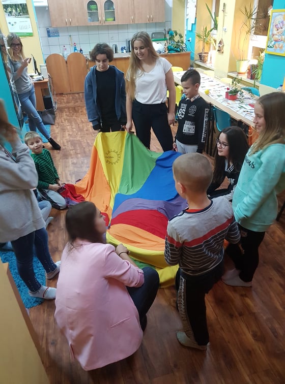 Z takim przesłaniem wolontariusze z Fundacji Motywacja i Działanie, w ramach realizowanego projektu „ Szkoła Młodego Animatora” przeprowadzili warsztaty dla dzieci  i młodzieży ze Środowiskowego Ogniska Wychowawczego Nr 2 TPD. Przewodnim tematem zajęć była  animacja czasu wolnego z metodami interaktywnej pracy grupowej. Nie zabrakło więc różnorodnych zabaw z chustą animacyjną oraz wielu innych usprawniających refleks i koordynację ruchową. Dzieci aktywnie uczestniczyły w zajęciach wykazując się przy tym dużą pomysłowością oraz umiejętnością pracy grupowej.