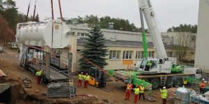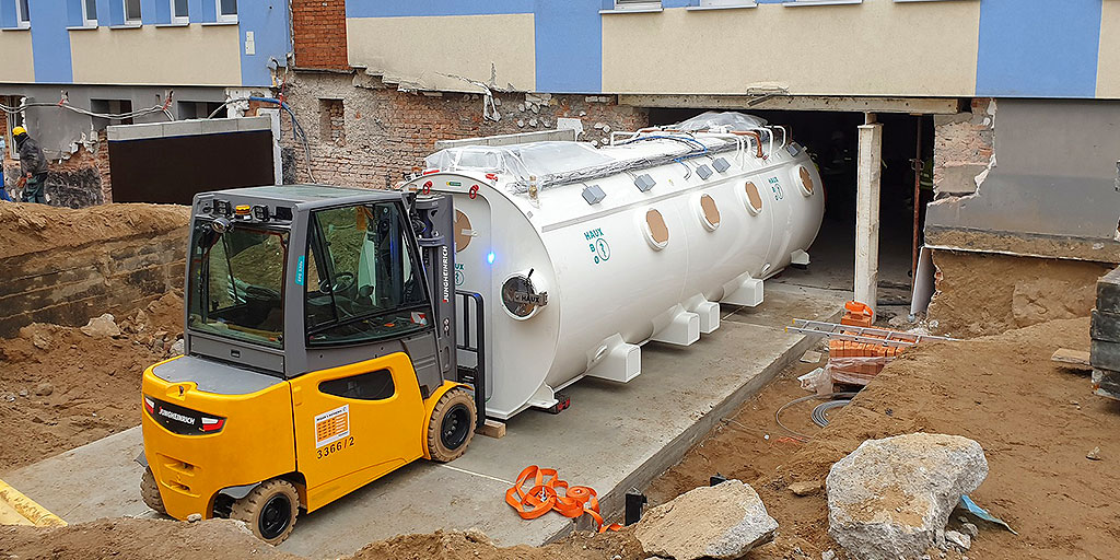 W szpitalu w Gryficach kilka dni temu zjawiła się spora przesyłka – komora hiperbaryczna, która wraz z osprzętem ma masę ok. 20 ton i aż 7 metrów długości. Jej rozładunek i umieszczenie w docelowym pomieszczeniu trwało kilka godzin, wymagało pracy wielu specjalistów i profesjonalnego sprzętu. To najbardziej skomplikowany logistycznie etap w całej inwestycji polegającej na utworzeniu Ośrodka Terapii Hiperbarycznej w SPZZOZ w Gryficach. Teraz przed wykonawcą kolejne etapy: instalacja komory, testy, dalsze roboty budowlane i wykończeniowe.