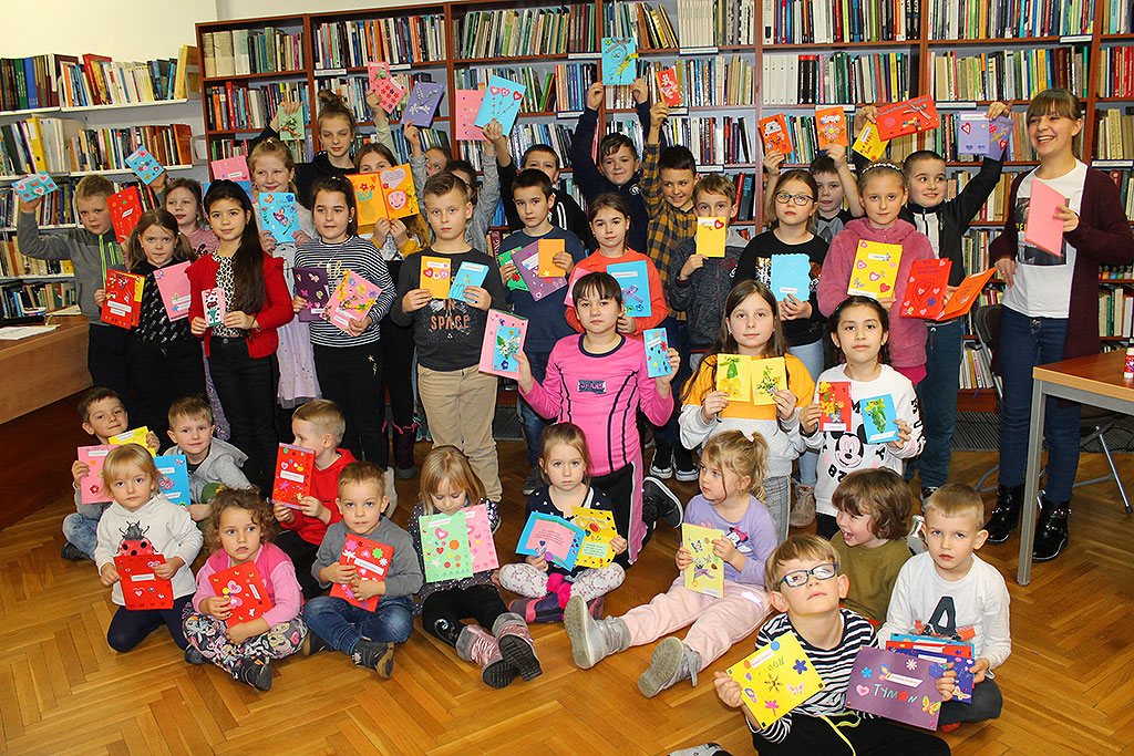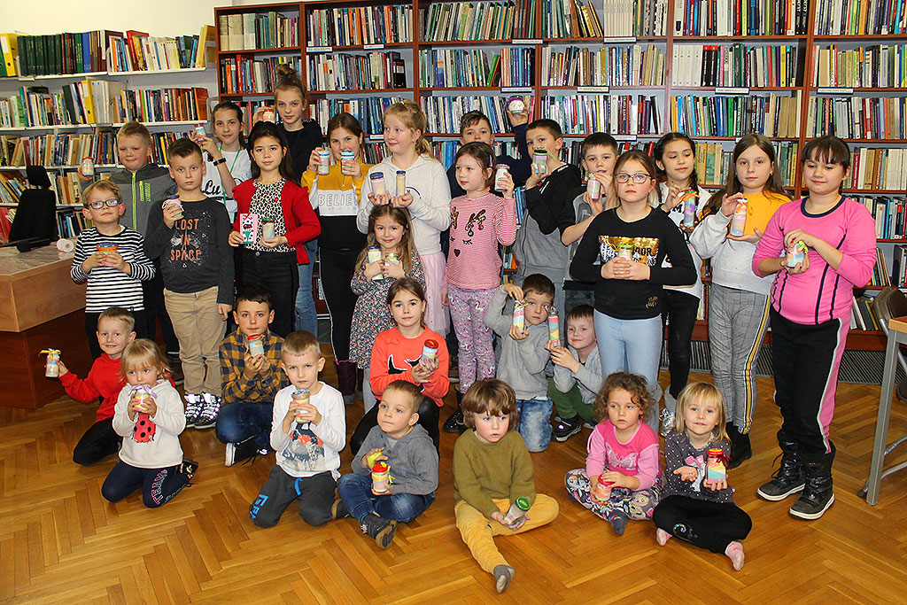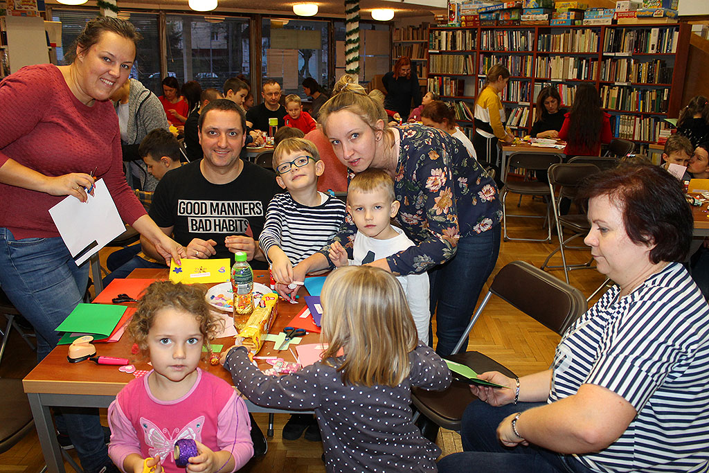 W spotkaniu wzięły udział całe rodziny. Niewielka sala czytelni wypełniła się po brzegi. Dzieci wraz z dorosłymi wykonały kartki dla babci i dziadka. Z kolorowych papierów, naklejek, koralików, wstążek i sznurków powstały niesamowite prezenty. Zaskoczeniem dla najmłodszych  oraz dorosłych był pomysł wykonania piaskowej mozaiki. Dzięki soli i kredzie we wszystkich kolorach tęczy powstały piękne obrazy w słoiku. Wszyscy z uśmiechem na twarzy wykonywali podarunki dla najbliższych. Na zakończenie zajęć uczestnicy zrobili sobie pamiątkowe zdjęcie.