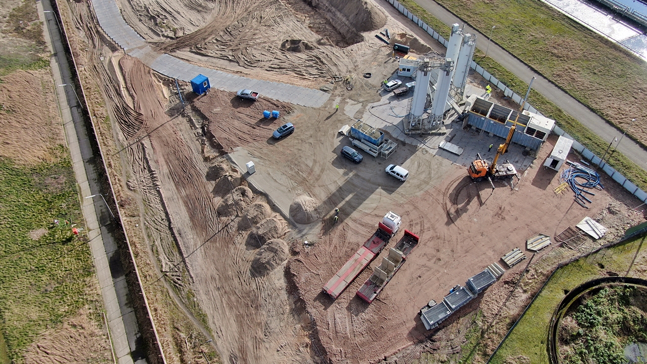 Wykonawca kontynuuje prace przy budowie Zakładu Prefabrykacji – przede wszystkim przygotowuje fundamenty pod halę zakładu. Prowadzi także rozruch węzła betoniarskiego. W ciągu ostatnich dni wykonane zostały już próbne zaroby – próbki przekazano do badań laboratoryjnych.