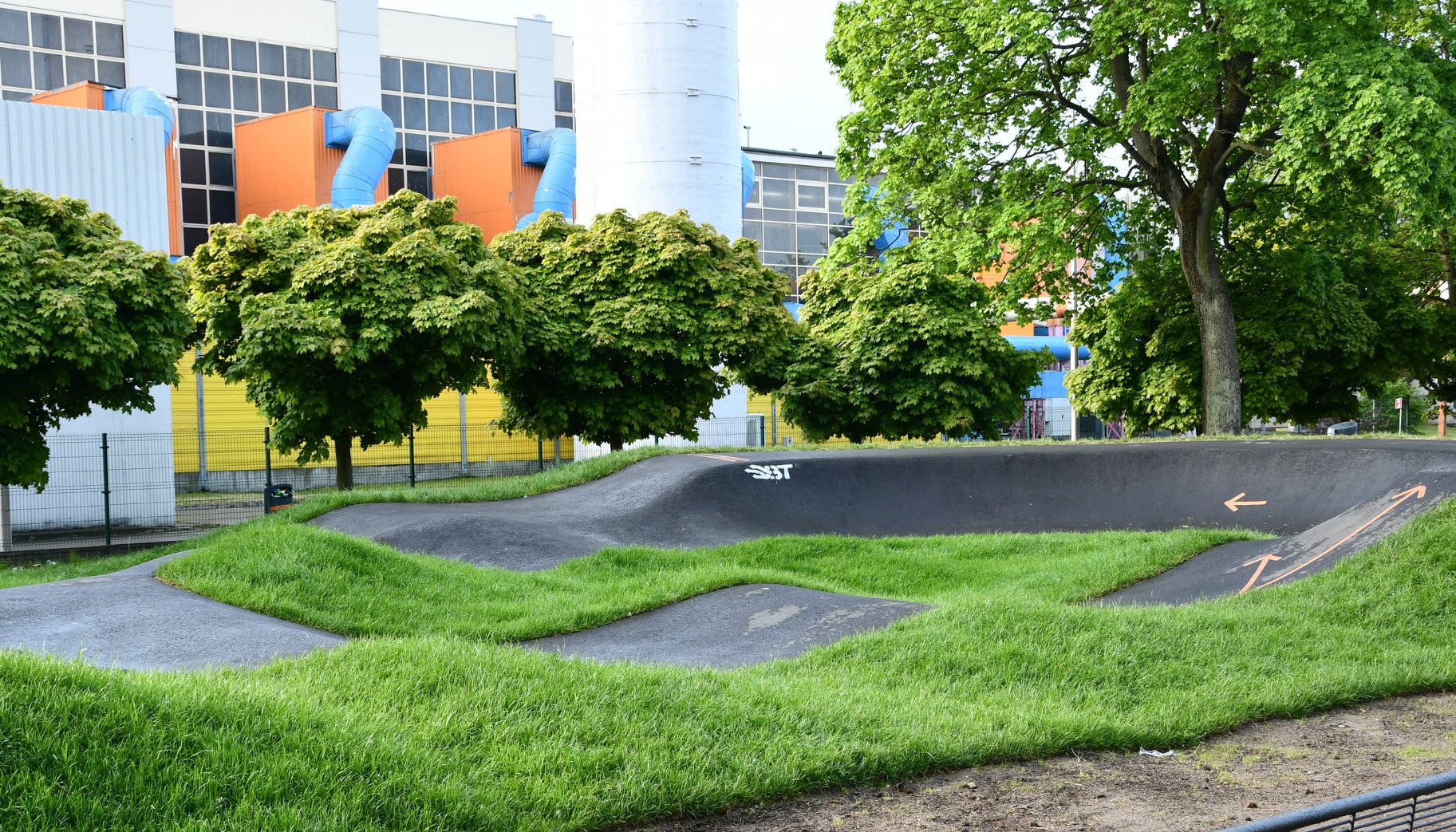 Pumptrack przy ul. Grunwaldzkiej powstał na wolnym terenie, tuż opodal drogi rowerowej w sąsiedztwie Przedsiębiorstwa Energetyki Cieplnej.