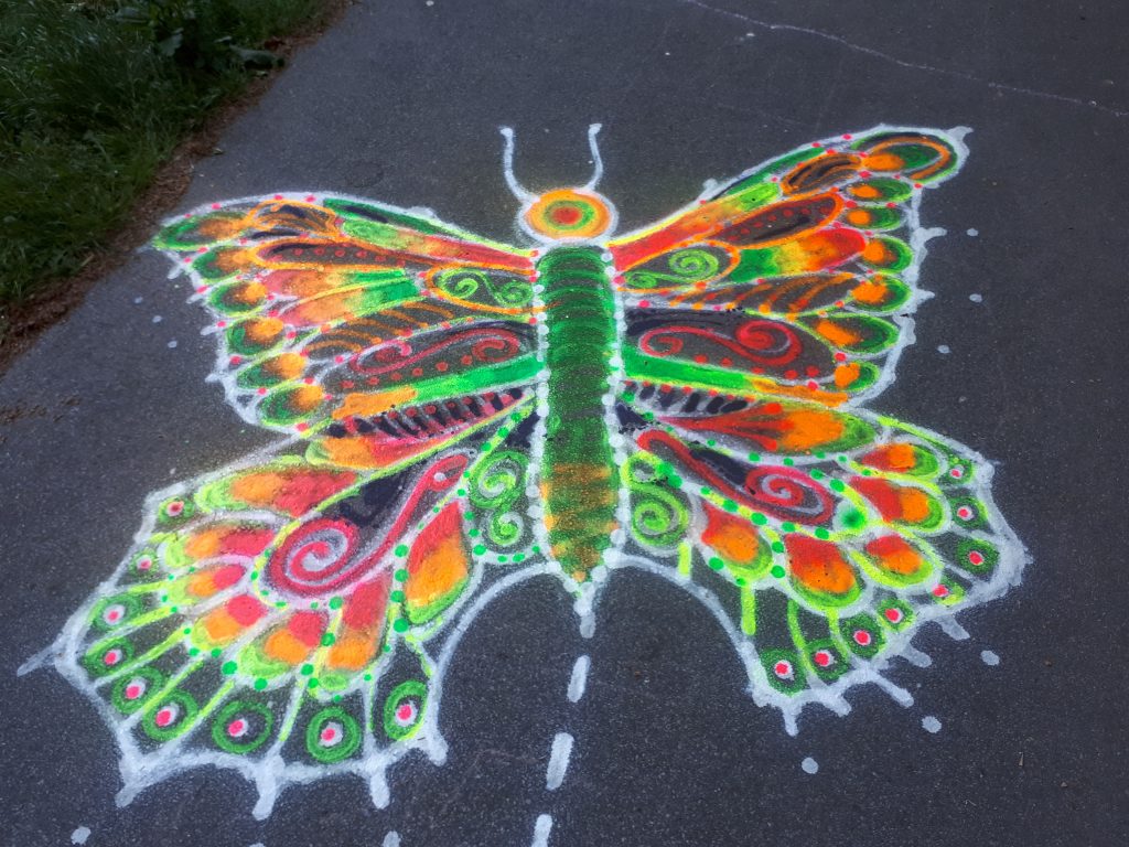 i gotowe do użytku. Poniżej znajdują się krótkie instrukcje gier. Zabawy rozrysowane są na alejce, przy boisku sportowym. Przykładowo można zrobić sobie zdjęcie zamieniając się motyla lub poskakać w tradycyjne klasy. Dla chłopców mamy również rozrysowany tor z ulicami dla resoraków. Można spróbować swoich sił, przechodząc na kilka sposobów przez kolorową pajęczynę pomiędzy drzewami. Świetną atrakcją dla całej rodziny może być zabawa w wypatrywanie ozdobionych kamyczków.