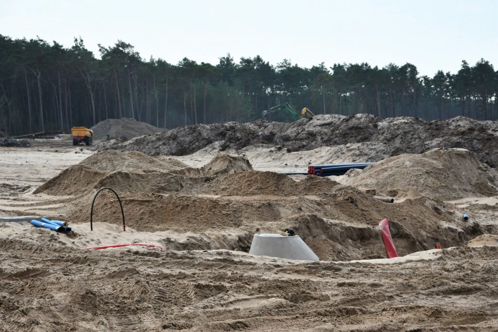Równocześnie trwają prace teletechniczne, związane z budową sieci oświetleniowej. Na kolejnych łącznikach wykonywane są prace związane z siecią wodociągową i sanitarną, która przechodzi próby ciśnieniowe. Na docelowym placu, gdzie powstanie Centrum Usług „Mulnik”, trwa makroniwelacja. Teren został oczyszczony z karpin (pozostałościach po usuniętych drzewach) i wyrównany. Urobek ziemny, który pozyskiwany jest przy budowie trasy dojazdowej na bieżąco trafia na teren głównego placu, gdzie wykorzystywany jest do makroniwelacji terenu.