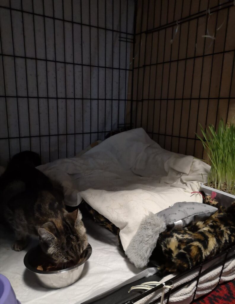 Na dzień dzisiejszy koteczka czuje się dobrze. Rana po operacji bardzo ładnie się goi. Kicia ma wielki apetyt, chyba musi nadrobić niedobory związane, najpierw z ciążą, wykarmieniem maluchów a później z chorobą. Musiała sobie radzić bez schronienia i pokarmu, ale była dzielną i opiekuńczą mamą.