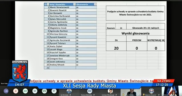 Tego jeszcze nie było. Dziś (17. grudnia 2020r.) Rada Miasta Świnoujście jednogłośnie przyjęła budżet miasta na przyszły rok, który zaproponował Prezydent Miasta Janusz Żmurkiewicz.
