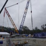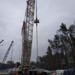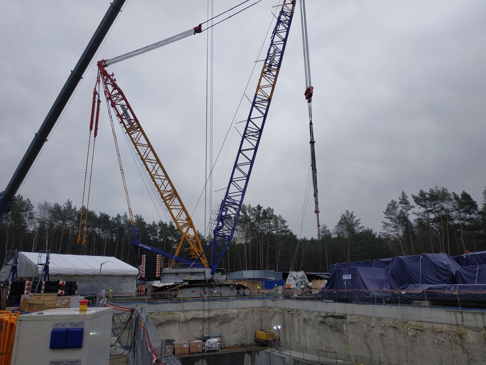 Na wyspie Uznam zakończył się montaż drugiego gigantycznego dźwigu o nośności 650 ton. Oba dźwigi służą do opuszczania elementów maszyny TBM do komory startowej, gdzie rozpocznie się drążenie tunelu pod Świną. Część komponentów maszyny TBM montowana jest na powierzchni, przy szybie startowym, jeszcze przed ich opuszczeniem. Część z nich składana jest we wnętrzu komory – obecnie kontynuowany jest tam montaż toru stalowego dla bram TBM oraz elementów tarczy TBM.