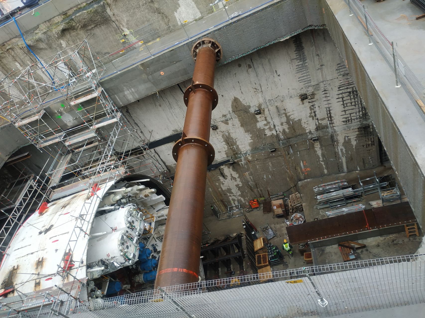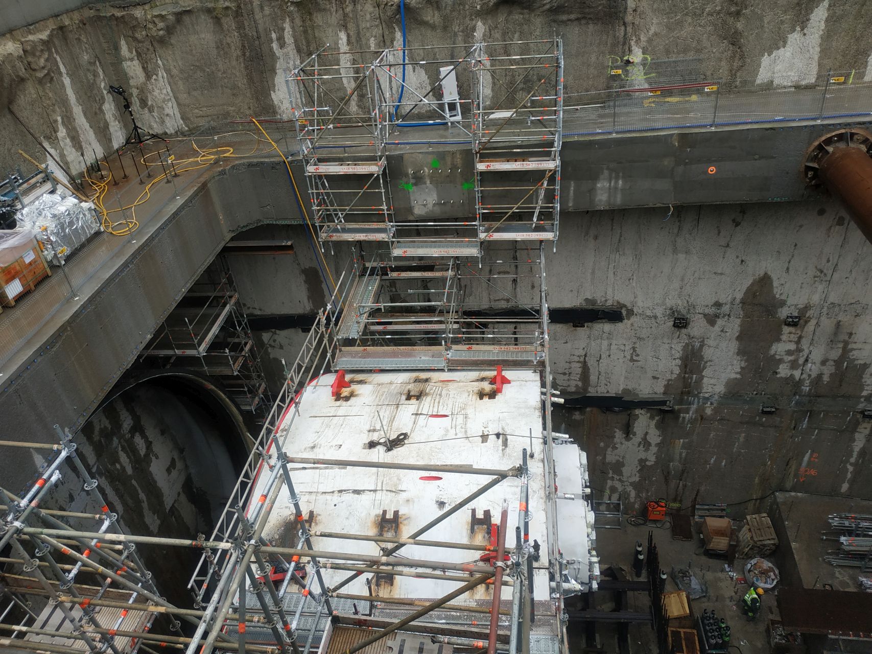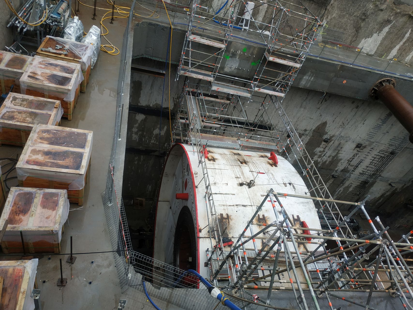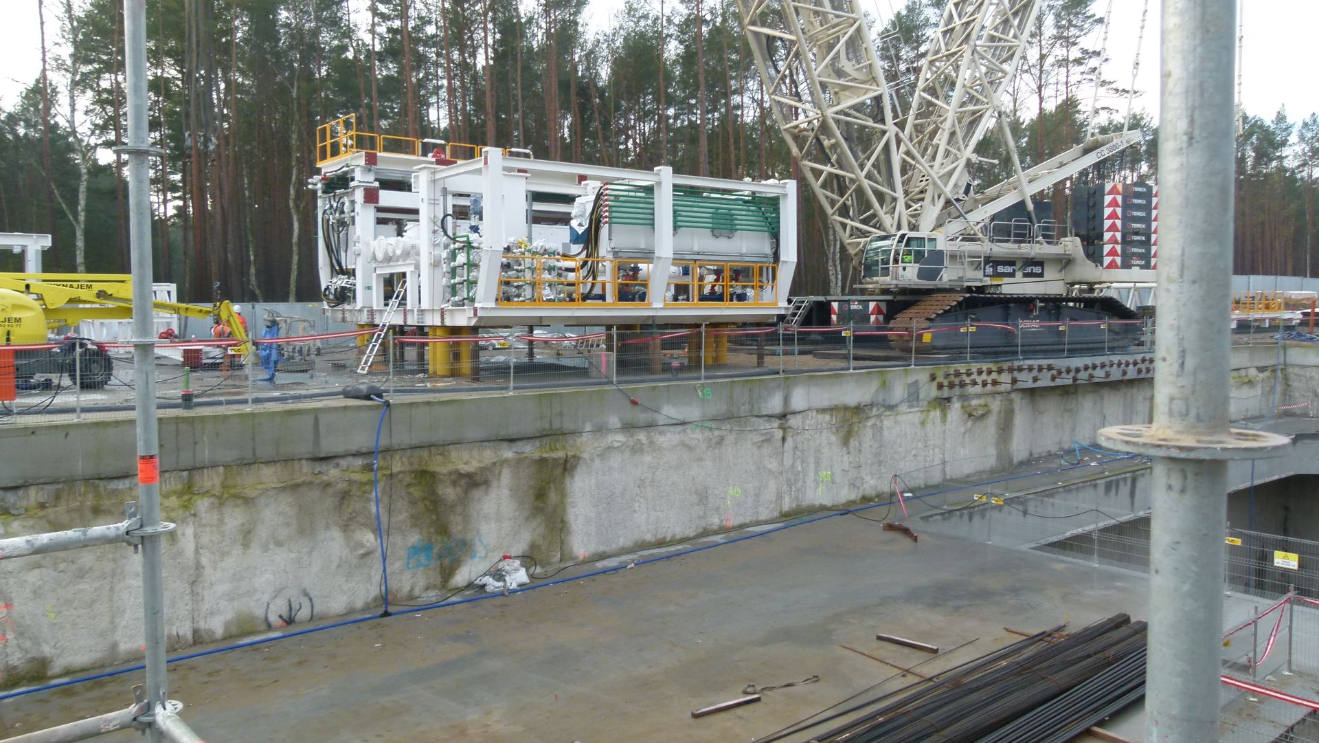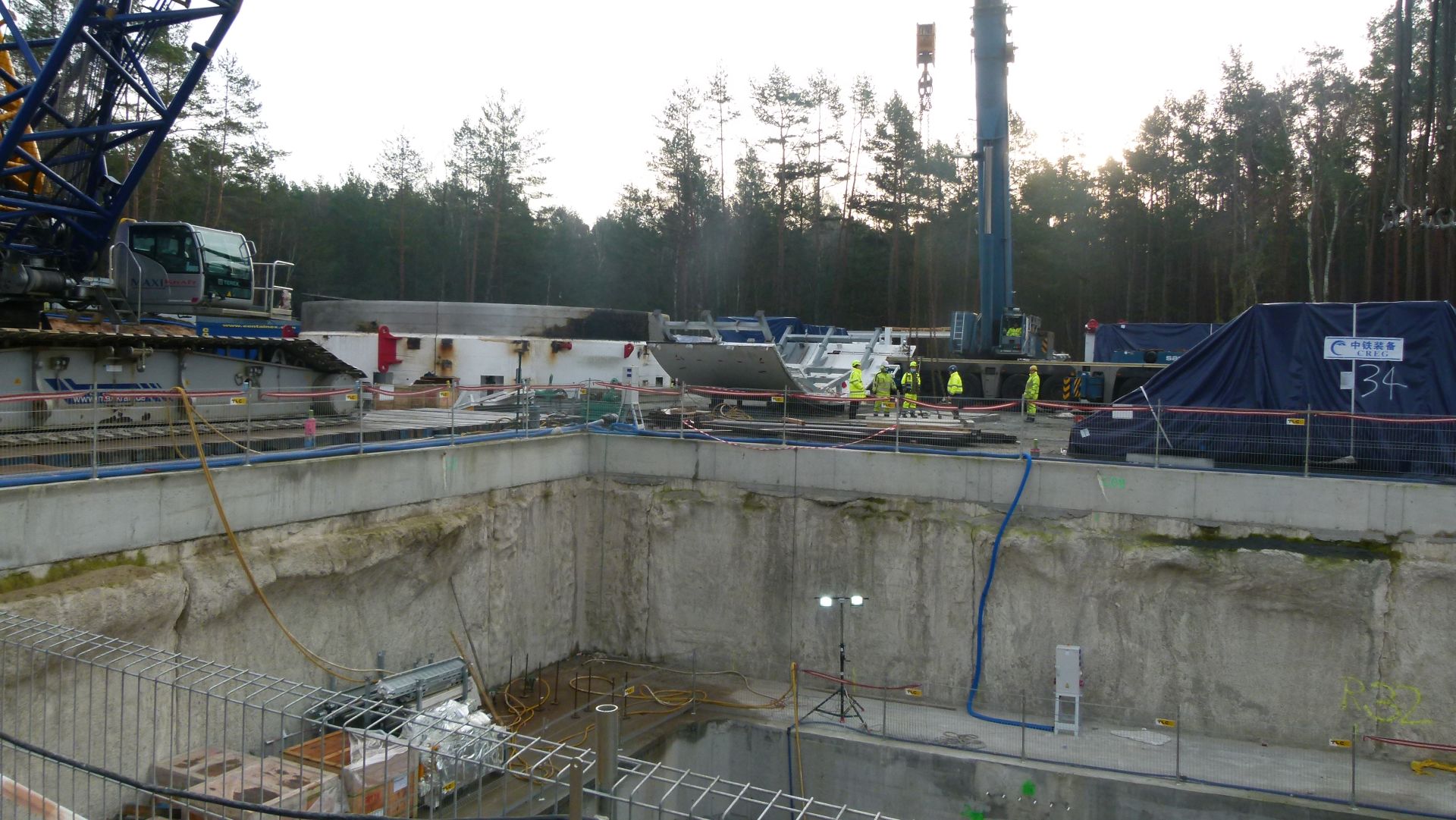 Po drugiej stronie Świny, na wyspie Uznam, intensywne prace trwają w rejonie komory startowej – na bieżąco jest ona odwadniania, uszczelniane są także ściany szczelinowe. Kontynuowany jest montaż elementów tarczy maszyny TBM w szybie startowym. W części frontowej tarczy trwa montowanie rusztowań, które będę potrzebne do spawania i dalszego montażu maszyny. Montaż elementów maszyny TBM odbywa się także na powierzchni, w sąsiedztwie komory startowej.