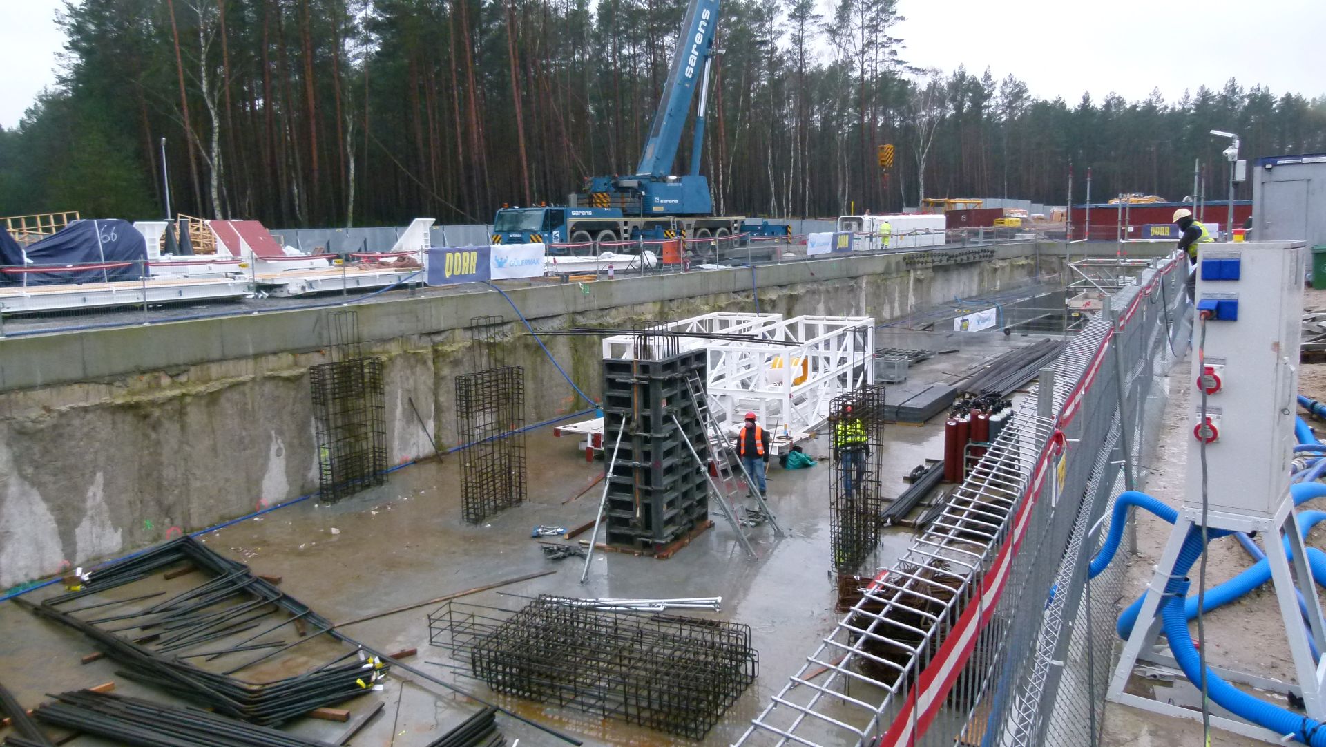 Równolegle odbywa się odwadnianie komory startowej oraz uszczelnianie ścian szczelinowych. W zeszłym tygodniu wykonywano tam również słupy i belki jezdne dla toru suwnicy, do opuszczania segmentów obudowy do szybu.